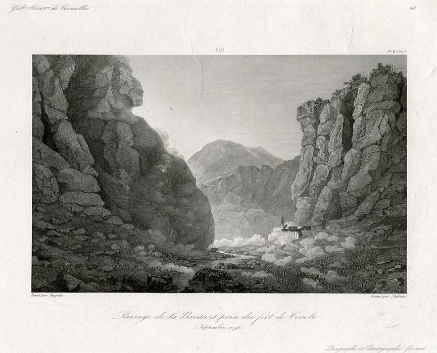 Incisione in acciaio di dimensioni 147x232 mm. Lievi difetti della carta. Condizioni : USATO - Stato : Buono, ordinari segni d'uso e del tempo. Altre note : Questa veduta rappresenta una delle battaglie napoleoniche combattute in Trentino nel settembre del 1796. Il titolo recita: "Passaggio del Brenta e presa di forte Covelo". L'autore, il pittore e architetto torinese Giuseppe Piero Bagetti, seguì l'esercito francese sul campo documentando visivamente la prima campagna di Napoleone in Italia. Pare che per realizzare le vedute studiasse le carte topografiche della zona e interrogasse i protagonisti della vicenda.