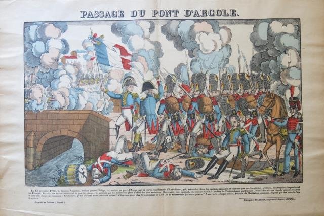 Epinal, Jean Charles Pellerin, 1850 - 1870 circa. Incisione su legno in coloritura d'epoca, cm 43 x 63 circa (il foglio). La veduta è stata incisa dal Georgin e stampata dal Pellerin, il più importante editore di Epinal, cittadina del dipartimento dei Vosgi, nella regione della Lorena. Al margine inferiore la didascalia descrittiva dell'episodio: la battaglia di Arcole fu comabttuta dal 15 al 17 novembre 1796. Piega centrale editoriale, lieve ingiallimento del foglio e minimi difetti marginali, piacevole coloritura, discreta conservazione.