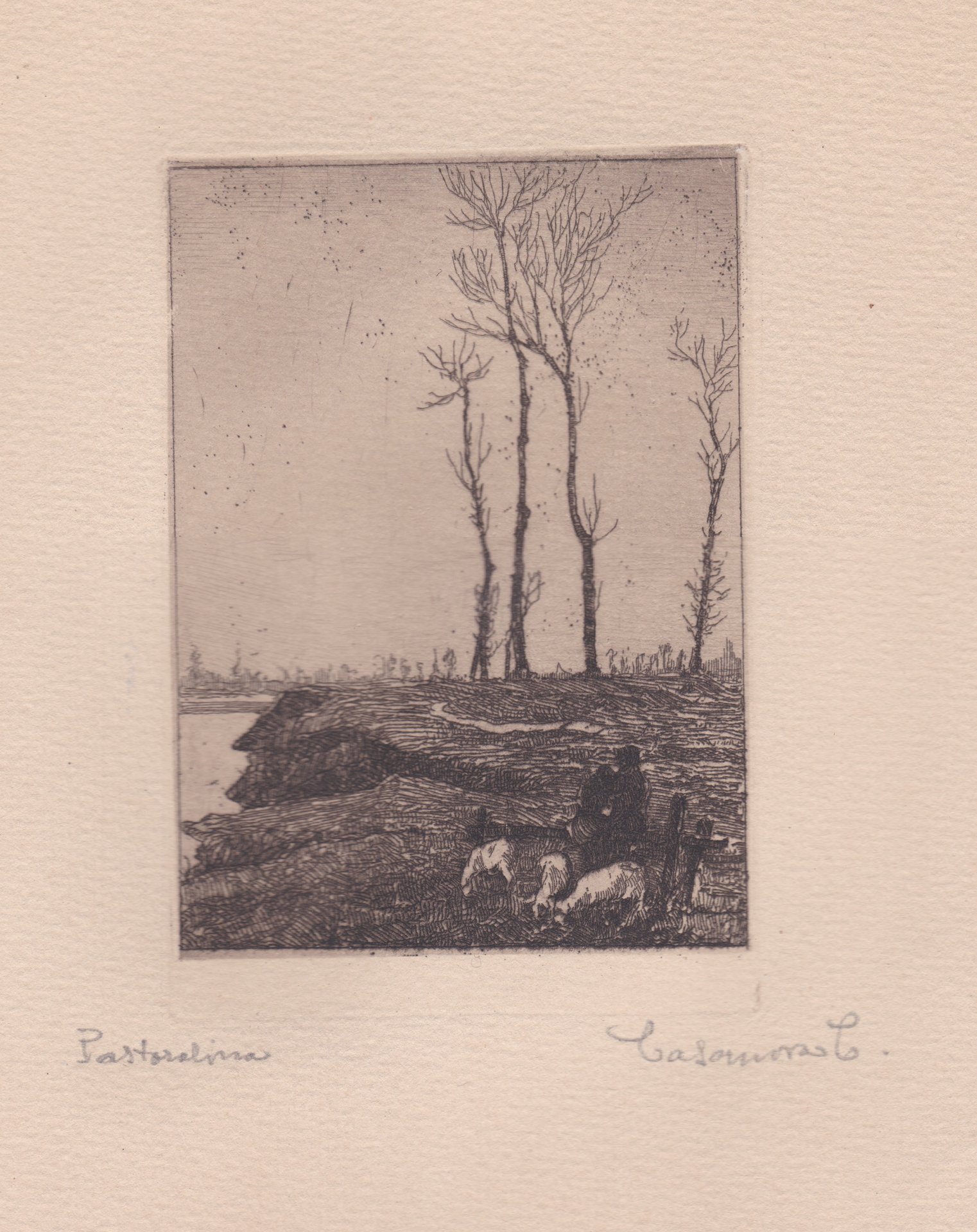 Tema di vita agreste affrontato spesso dall'autore il quale, come in questo caso, raffigura uno spaccato di vita di una giovane pastore. In primo piano l'uomo conduce tre pecore al pascolo vicino alla sponda di un fiume. Il tratto fitto descrive esili tronchi d'alberi spogli, il cielo sgombro occupa la maggior parte della lastra e suggerisce la luce di una plumbea giornata invernale. Un sottile velatura di fondo attutisce il chiaroscuro. In basso oltre l'inciso a matita: Pastoralina, Casanova C.