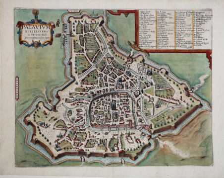 Pianta della città pubblicata nel sesto volume del ' Civitates orbis terrarum del 1617. "Seguendo schemi già noti, la veduta rappresenta, vista da ovest, la città entro le mura. Buono è l'effetto d'insieme, ben definite appaiono le principali emergenze civili e religiose, mentre sommaria risulta la definizione dell'assetto edilizio minore. Pur derivando dalla carta pubblicata nel Theatrum urbium italicarum di Pietro Bertelli (Mazzi, 1980, 244), la veduta si connota di una certa volontà di migliora- mento del livello espositivo. La carta comparve inizialmente nel Liber Sextus, pubblicato nel 1617, dell'opera intitolata Civitates orbis terrarum. Questo lavoro, ideato come raccolta complementare al Theatrum orbis terrarum di Abraham Ortelius (Anversa, 1570) e più comunemente noto come Theatrum Urbium Francisci Hogenberg & Georgii Braun ecc. (Marinelli, 1881, 114, n. 562), fu il primo effettivo atlante sistematico di città. Suddiviso in sei volumi, esso usci tra il 1572 (anno in cui ottenne privilegio imperiale) e il 1617. Appunto nel 1572 fu pubblicato il primo tomo scritto in latino e comprendente 59 tavole prive di numerazione; il volume ebbe un notevole e immediato successo, tanto che fu ristampato otto volte (1575, 1577, 1582, 1588, 1593, 1599, 1612, 1623). La sua versione in tedesco, intitolata Beschreibung und Contrafactur der Vornem- bster Städte der Welt, ebbe due edizioni (1574, 1582), mentre quella in francese, con il titolo Le grand théâtre des différentes citès du monde, ne ebbe una (1575). Al primo tomo seguirono il secondo pubblicato nel 1575, il terzo nel 1581 e il quarto nel 1588, ciascuno dei quali con 58 illustrazioni; l'opera continuò nel 1589 con il quinto tomo, che raccolse 69 illustrazioni, e si concluse nel 1617 con il sesto, che ne riuni nuovamente 58. Pubblicata in quest'ultimo tomo, la carta di Padova è posta a pagina 55. I principali curatori dell'opera furono il canonico della cattedral, Colonia, Georgius Braun (Georg Bruin von Braun), e due calcors della stessa città, Franciscus Hogenberg (Franz Hogenberg) e Simon Novellanus (Simon van der Neuvelt). Questi ultimi due per realizza. re le loro incisioni fecero ampio uso di disegni di vari autori, Tra questi è da ricordare particolarmente Georgius Hoefnaglius (Georg o Joris Hoefnagel; Anversa, 1542 - Vienna, 1600) che nel corso dei suoi lunghi viaggi in Europa elaborò una copiosa serie di rappresentazioni urbane Georg Bruin von Braun (Colonia, 1541 ivi, 1622) diresse fin dall'inizio il Civitates orbis terrarum con l'obiettivo di renderlo più celebre della ormai famosa Cosmographia universalis di Sebastiano Münster. Si riservò il compito di scrivere il commento storico- geografico che accompagna le tavole e a lui si deve la scelta di impiegare, per il corredo iconografico, l'incisione in rame al posto della tradizionale xilografia (Koeman, 1969, II, 10-11). L'incisore Franz Hogenberg (Mecheln, 1540 c.a Colonia, 1590 c.a) incise gran parte delle lastre impiegate nella stampa dei primi quattro tomi di questa raccolta, tra cui tutte le 58 del terzo. Simon van der Neuvelt, disegnatore e acquafortista, fu attive a Colonia dal 1560 al 1590" (cfr. S. Ghironi, Padova, n. 19). Acquaforte, finemente colorata a mano, in ottimo stato di conservazione. Bibliografia Ghironi, Padova - Piante e Vedute (1449-1865), n.19; ' ' Van der Krogt 4. Antique map - Bird's-eye view plan of Padua, by Braun and Hogenberg. ' With key to 80 locations. "Seguendo schemi già noti, la veduta rappresenta, vista da ovest, la città entro le mura. Buono è l'effetto d'insieme, ben definite appaiono le principali emergenze civili e religiose, mentre sommaria risulta la definizione dell'assetto edilizio minore. Pur derivando dalla carta pubblicata nel Theatrum urbium italicarum di Pietro Bertelli (Mazzi, 1980, 244), la veduta si connota di una certa volontà di migliora- mento del livello espositivo. La carta comparve inizialmente nel Liber Sextus, pubblicato nel 1617, dell'opera intitolata Civitates orbis terrarum. Questo lavoro, ideato come raccolta complementare al Theatrum orbis terrarum di Abraham Ortelius (Anversa, 1570) e più comunemente noto come Theatrum Urbium Francisci Hogenberg & Georgii Braun ecc. (Marinelli, 1881, 114, n. 562), fu il primo effettivo atlante sistematico di città. Suddiviso in sei volumi, esso usci tra il 1572 (anno in cui ottenne privilegio imperiale) e il 1617. Appunto nel 1572 fu pubblicato il primo tomo scritto in latino e comprendente 59 tavole prive di numerazione; il volume ebbe un notevole e immediato successo, tanto che fu ristampato otto volte (1575, 1577, 1582, 1588, 1593, 1599, 1612, 1623). La sua versione in tedesco, intitolata Beschreibung und Contrafactur der Vornem- bster Städte der Welt, ebbe due edizioni (1574, 1582), mentre quella in francese, con il titolo Le grand théâtre des différentes citès du monde, ne ebbe una (1575). Al primo tomo seguirono il secondo pubblicato nel 1575, il terzo nel 1581 e il quarto nel 1588, ciascuno dei quali con 58 illustrazioni; l'opera continuò nel 1589 con il quinto tomo, che raccolse 69 illustrazioni, e si concluse nel 1617 con il sesto, che ne riuni nuovamente 58. Pubblicata in quest'ultimo tomo, la carta di Padova è posta a pagina 55. I principali curatori dell'opera furono il canonico della cattedral, Colonia, Georgius Braun (Georg Bruin von Braun), e due calcors della stessa città, Franciscus Hogenberg (Franz Hogenberg) e Simon Novellanus (Simon van der Neuvelt). Questi ultimi due per realizza. re le loro incisioni fecero ampio uso di disegni di vari autori, Tra questi è da ricordare particolarmente Georgius Hoefnaglius (Georg o Joris Hoefnagel; Anversa, 1542 - Vienna, 1600) che nel corso dei suoi lunghi viaggi in Europa elaborò una copiosa serie di rappresentazioni urbane Georg Bruin von Braun (Colonia, 1541 ivi, 1622) diresse fin dall'inizio il Civitates orbis terrarum con l'obiettivo di renderlo più celebre della ormai famosa Cosmograp