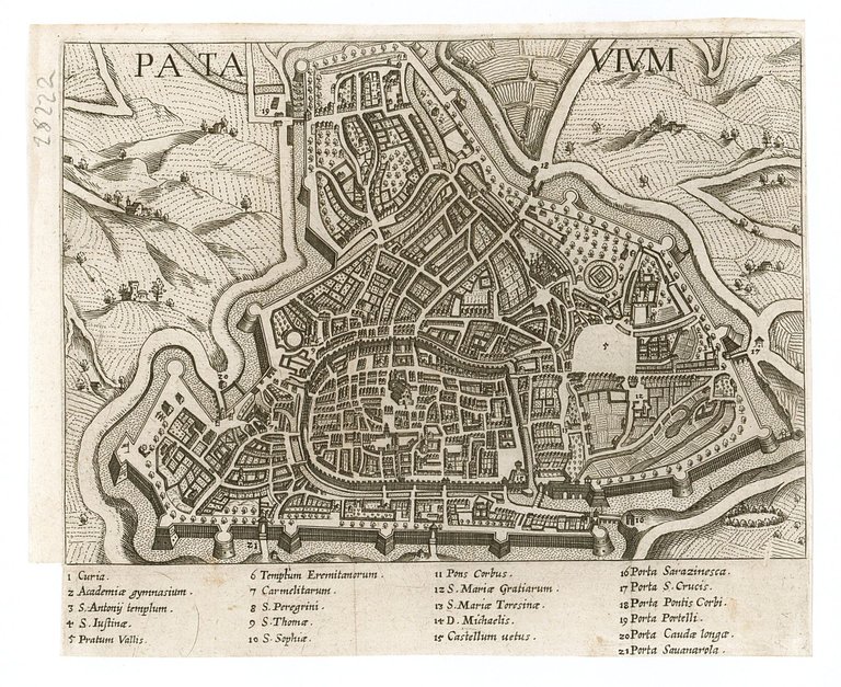 Pianta planimetrico prospettica, antica ed originale, della città. In calce rimandi da 1 a 21, peiga editoriale. Autore: Pflaumern, Ioannis - Henrici & Wolfagang Kilian fecit. Luogo: Padova. Anno: 1625. Tecnica: incisione in rame. Dimensioni: 132x189 mm