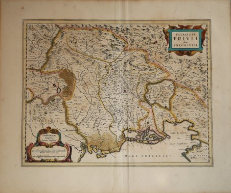 Carta tratta dell'Atlas sive cosmographicae meditationes de fabrica mundi ' curato da Hendrick Hondius. Basata sulla carta di Giovanni Antonio Magini pubblicata nel 1620 a Bologna. Nel 1604, Jodocus Hondius (1563-1612) - probabilmente tramite Cornelis Claesz - acquistò le matrici in rame dell'Atlas sive cosmographicae meditationes de fabrica mundi ' di Gerard Mercator all’asta. Aggiunse circa 40 mappe, comprese nuove mappe dei continenti e importanti mappe regionali delle Americhe, prima di pubblicare una nuova edizione dell’opera, nel 1606, in concorrenza con il ' Theatrum Orbis Terrarum ' di Ortelius. Poiché molte delle mappe erano più aggiornate, la raccolta di Mercator & Hondius sostituì effettivamente il ' Theatrum ' di Ortelius. ' ' L’atlante del 1606 include tutte le 107 mappe dell’edizione del 1595, oltre a 37 nuove mappe, abilmente incise dallo stesso Hondius. La seconda edizione della raccolta seguì già nel 1607/08, mentre la prima edizione in un’altra lingua, il francese, fu messa sul mercato nel 1609. Apparentemente questa fu considerata come la terza edizione, perché nel 1611 apparve l'Editio Quarta, ' con un totale di 150 mappe. Dopo la morte di Jodocus Hondius (1612) la sua vedova e i suoi figli continuarono la stampa dell’atlante. Jodocus Junior ( o Jodocus II, 1594-1629) produsse diverse ristampe tra il 1613 e il 1619, sempre con le stesse 150 mappe; nel 1619 furono invece aggiunte sei nuove mappe. Dopo il 1620 la pubblicazione venne curata da Hendrick (Henricus) Hondius (1597-1651), il secondo figlio di Jodocus senior. Varie edizioni apparvero, nel 1623, 1628 e 1630. Hendrick fu il primo ad apportare dei veri cambiamenti: nell’edizione del 1628 firmò alcune mappe di Mercatore con il proprio nome. Nel 1630, quando probabilmente stava già collaborando con suo cognato Johannes Janssonius, aggiunse nove nuove carte. ' Le carte dell'Italia, di derivazione maginiana, vengono stampate per la prima volta nel ' Theatrum Italiae in quo Eius Regna, Domina, Ducatus, Et Speciatim Illorum Provinciae, Tabulis Accuratissimis, Iam, De Novo in Lucem Editio, Describunter, Quorum Sequens Pagina Indicabit, stampato ad Amsterdam da Hendrick Hondius nel 1636. Sebbene con l'imprint di Hondius, la raccolta contiene anche carte firmate da Johannes Janssonius (cfr. Koeman, ' Atlas Neerlandici, vol. II pp. 379-380, Me 43). “Essa è una derivazione diretta dalla carta particolare del Friuli, con titolo uguale, contenuta nell'Atlante maginiano, rispetto alla quale presenta solo diversità di carattere stilistico, che ne fanno un prodotto innegabilmente migliore nella forma. Sono state mantenute le stesse posizioni del cartiglio e della scala, la quale, però, è stata modificata nel rapporto. I limiti della regione rappresentata coincidono con quelli del Magini, salvo l'unica eccezione riguardante una sotti- le striscia del lato orientale. Non corrispondono, però, i valori di longitudine riportati sulle fasce marginali. Del tutto identico è il disegno delle coste e del reticolo idrografico, al punto che il corso del Motegano f., cioè del fiume Monticano, non è stato completato come, invece, la sostituzione della dedica con la figura del putto che regge le cornucopie avrebbe permesso; vi sono riportate, con estrema cura, le stesse sedi umane e sono ripetuti tutti gli errori. Si notano soltanto alcune omissioni, (come quelle di S. Serno per S. Servolo vicino a Trieste o di Antignano, Villa de Cani e S. Antonio nella penisola istriana dovute, forse, al predetto spostamento dell'inquadra- tura), qualche insignificante differenza di grafia nella . nomenclatura (come Cra M. al posto del maginiano cra M., risultato da una omissione da parte dell'incisore per indicare gli Ocra M., nell'alto corso dell'Isonzo, o Punta Distrugnan per Punta distrugnan); oppure qualche lieve storpiatura come Basaldello per Basaldella. Ben poca cosa, come si vede, che però diventerà significativa se di queste piccole diversità ci servire. Map taken from the ' Atlas sive cosmographicae meditationes de fabrica mundi ' edited by Hendrick Hondius and based on the work by Giovanni Antonio Magini. In 1604, Jodocus Hondius (1563-1612) – probably trought Cornelis Claesz - bought the copperplates of Mercator’s ' Atlas sive cosmographicae meditationes de fabrica mundi ' at the auction of Gerard Jr.’s effects. He added about 40 maps, including new maps of the Continents and important regional maps of the Americas, before publishing a new edition of the Atlas, in 1606, in competition with Ortelius’ ' Theatrum Orbis Terrarum. As many of the maps were more up-to-date, the Mercator-Hondius Atlas effectively superseded Ortelius’ ' Theatrum. ' This atlas from 1606 include all 107 maps from the 1595 edition, as well as 37 new maps, skillfully engraved by Hondius, of various authors. The second edition of the Mercator-Hondius atlas followed as soon as 1607/08. The first edition in another language, French, was put on the market in 1609. Apparently this one was regarded as the third edition, because in 1611 ' Editio Quarta ' appeared with a total of 150 maps. After the death of Jodocus Hondius in 1612 his widow and sons continued the publication of the ' Atlas. ' For instance Jodocus Junior (1594-1629) produced several new editions of the ' Editio Quarta ' between 1613 and 1619, each with the same 150 maps. Finally in 1619 the last edition of this atlas followed, to which six new maps were added. After 1620 the publication of the ' Atlas ' was continued by Henricus Hondius (ca. 1596/97-1651), the second son of Jodocus senior. Various editions appeared, in 1623, 1628 and 1630. Henricus Hondius was the first to make some real changes: in the 1628 edition he provided some Mercator maps with his own name. In 1630, when he was probably already cooperating with his brother-in- law Johannes Janssonius, Henricus added nine new maps. The maps of Italy, derived from Magini, were first printed in the ' Theatrum Italia