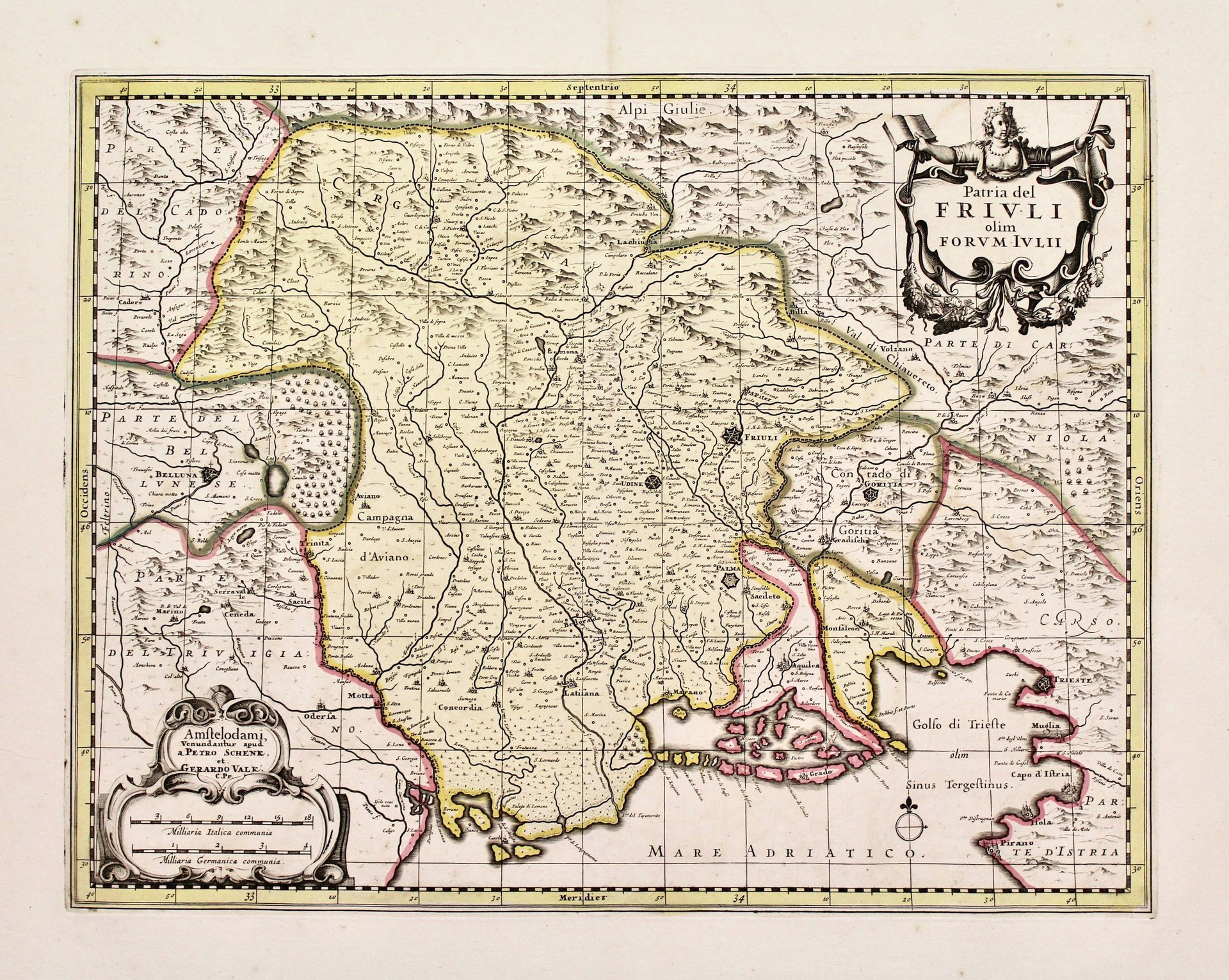 Incisione in rame, coloritura originale d'epoca, mm 375x485. Non comune, decorativa carta, arricchita da due elaborati cartigli. Piacevole carta del territorio. Schenk e Valk fondarono una società editoriale che pubblicò lastre acquistate da editori precedenti. Ottimo esemplare marginoso.