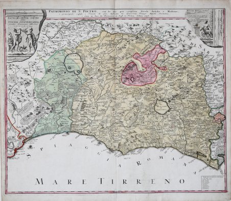 Interessante carta geografica dell'alto Lazio derivante dal modello di Ameti, pubblicata nel 1696.La mappa mostra una parte della costa occidentale italiana che va da Roma a Orbetello. Civitavecchia è indicata nel centro della costa. Tra le altre città indicate si trovano Viterbo, Valentano, Montefiascone, Civita Castellana. Johann Baptist Homann è stato un geografo e cartografo tedesco; nel 1702 fondò la sua casa editrice. Homann acquisì fama come uno dei principali cartografi tedeschi, e nel 1715 fu nominato geografo imperiale dall'imperatore Carlo VI. Nello stesso anno fu anche nominato membro dell'Accademia Prussiana delle Scienze a Berlino. Nel 1716 Homann pubblicò il suo capolavoro ' Grosser Atlas ueber die ganze Welt. Numerose mappe furono redatte in collaborazione con l'incisore Christoph Weigel. Homann morì a Norimberga nel 1724. Gli successe suo figlio Johann Christoph (1703-1730). L'azienda continuò dopo la sua morte come azienda degli eredi Homann, gestita da Johann Michael Franz e Johann Georg Ebersberger. Dopo successivi cambiamenti nella gestione, l'azienda si sciolse nel 1852. ' Incisione in rame, coloritura l'originale in ottimo stato di conservazione. Interesting map of the north portion of Lazio derived by the Ameti model, published in 1696.The map shows part of the west coast of Italy between Rome and Orbetello. Civitavecchia is shown in the centre of the coast. Other towns marked include Viterbo, Valentano, Montefiascone, Civita Castellana.This is a large antique map, printed on thick, good quality paper with original outline hand colour and decorative vignettes. Johann Baptist Homann was a German geographer and cartographer; in 1702 he founded his own publishing house. Homann acquired renown as a leading German cartographer, and in 1715 was appointed Imperial Geographer by Emperor Charles VI. In the same year he was also named a member of the Prussian Academy of Sciences in Berlin. In 1716 Homann published his masterpiece ' Grosser Atlas ueber die ganze Welt; numerous maps were drawn up in cooperation with the engraver Christoph Weigel the Elder. Homann died in Nuremberg in 1724 and was succeeded by his son Johann Christoph (1703-1730). The company carried on upon his death as Homann heirs company, managed by Johann Michael Franz and Johann Georg Ebersberger. After subsequent changes in management the company folded in 1852. ' Etching with fine original colour, good condition. Cfr.