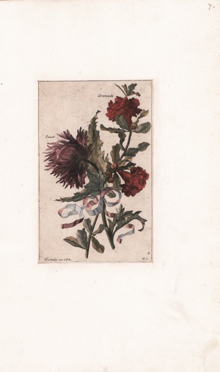 Acquaforte e bulino, circa 1680, dalla serie dal titolo ' Livre de Fleurs par Vauquer ' stampata e pubblicata a Parigi dall'editore e mercante di stampe Francois de Poilly intorno al 1680. Vauquer (o Vauquier) era un incisore, disegnatore e incisore di oro (1621-86). Le sue superbe stampe mostrano una delicata incisione, secondo le sue composizioni e quelle di Jean-Baptiste Monnoyer, suo maestro e parente. A parte alcuni soggetti biblici su fondo nero per medaglie, tabacchiere o casse di orologi, egli rappresentò soprattutto fiori in bouquet o in vasi, cesti, ghirlande o fregi. Vauquer è considerato uno dei più prestigiosi disegnatori di composizioni di fiori del Seicento europeo, i suoi lavori sono inseriti nelle più importanti collezioni pubbliche e private del mondo. Questi furono pubblicati da Nicolas Langlois (1640-1703) o François de Poilly (1623-93), spesso raggruppati in serie: ' Livre de fleurs ' (10 tavole); ' Vases de fleurs propre pour les peintres, brodeurs et dessinateurs ' (40 tavole); ' Livres de fleurs propre pour les orfèvres et graveurs ' (8 tavole, firmate v. f. con l'annotazione à Blois). Secondo Mariette, Vauquer era abile nel disegnare fiori ed eccelleva particolarmente nell'incisione di fiori e altre decorazioni su gioielliBibliografiaDunthorne, ' Flower and Fruit Prints of the 18th and early 19th centuries ' (1938), 317. Etching with engraving, circa 1680, from the series entitled ' Livre de Fleurs par Vauquer ' printed and published in Paris by publisher and print dealer Francois de Poilly around 1680. Vauquer (or Vauquier) was an etcher, draughtsman and gold-engraver (1621-86). His superb prints show a ‘delicate line, after his own compositions and those of Jean-Baptiste Monnoyer, his master and kinsman. Apart from a few biblical subjects on black ground for medals, snuff-boxes or watch-cases, he mostly represented flowers in bouquets or in vases, baskets, garlands or friezes. These were published by Nicolas Langlois (1640–1703) or François de Poilly (1623–93), often grouped in series: ' Livre de fleurs ' (10 pls); ' Vases de fleurs propre pour les peintres, brodeurs et dessinateurs ' (40 pls); ' Livres de fleurs propre pour les orfèvres et graveurs ' (8 pls, signed v. f. with the annotation à Blois). According to Mariette, Vauquer was skilled in drawing flowers and particularly excelled in engraving flowers and other decorations on jewellery’ (Grove Art). Contemporary and later collections of these plates are rare and show considerable variation, the individual parts and probably the plates themselves sold and bound to order. Literature Dunthorne, ' Flower and Fruit Prints of the 18th and early 19th centuries ' (1938), 317. Cfr.