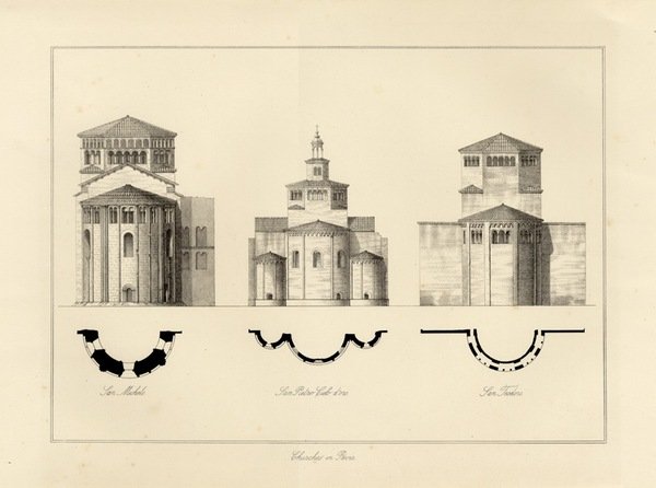 PAVIA - "Churches in Pavia" tavola con alzati e piante dei tre absidi di San Michele, San Pietro Cielo d'oro e San Teodoro.