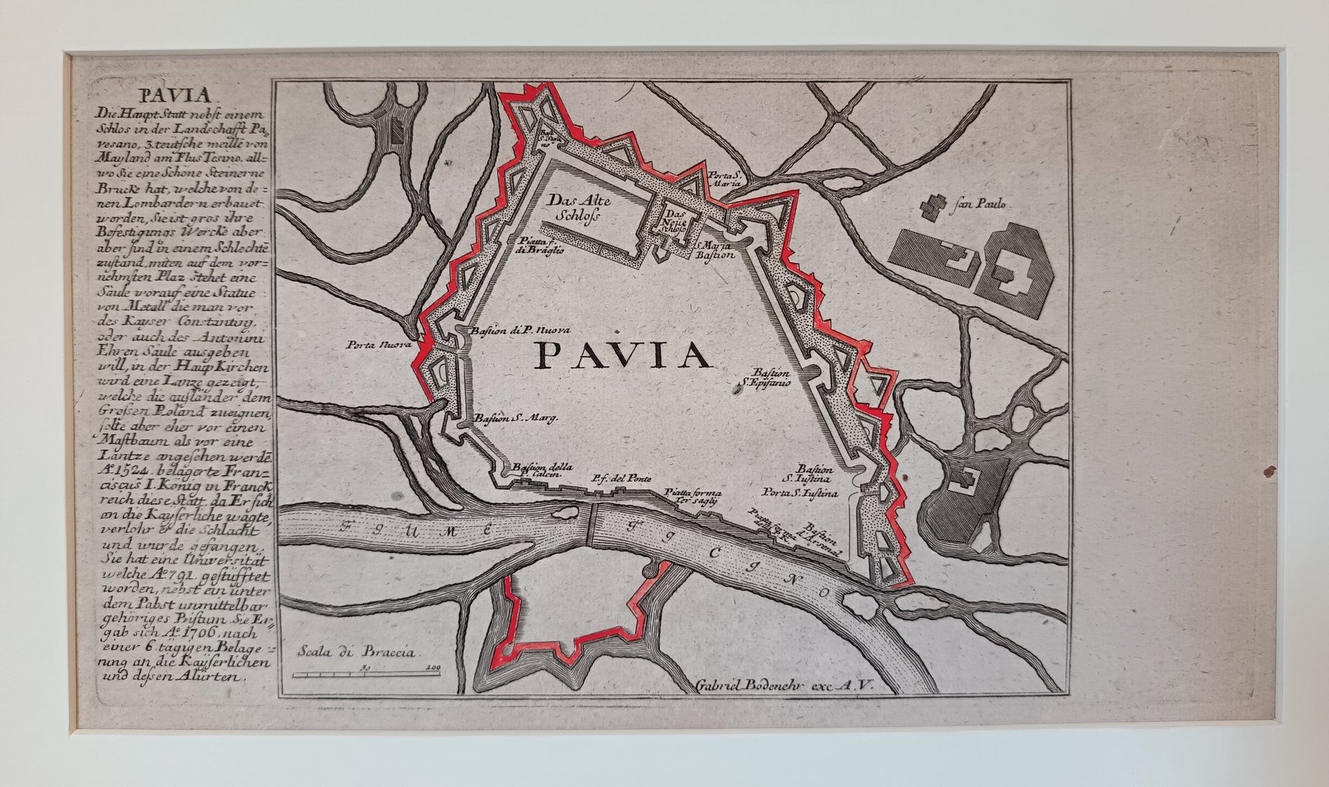 La lastra era inserita nell'opera Force d'Europe, oder Die Merckwürdigst und Fürnehmste, meistentheils auch Ihrer Fortification wegwn Berühmteste Staette, Vestungen, Seehaefen, Paesse, Camps de Bataille, in Europa, [...] edita ad Augsburg nel 1720 ca. Viene rappresentata la pianta di Pavia e le mura fortificate. A sinistra titolo e descrizione in tedesco della città.