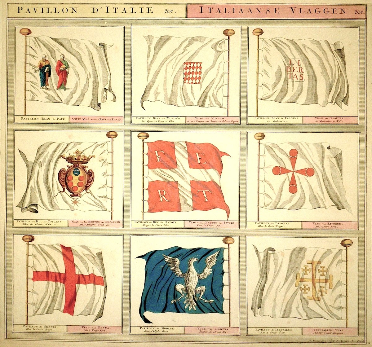 Incisione in rame di mm 495x535, colorata a mano, tratta dall'Atlante nautico di Mortier. Fascinosa serie di 9 bandiere marinare italiane: sono rappresentate i vessilli del Papato, di Monaco, di Ragusa, del Ducato di Toscana, Ducato di Savoia, di Livorno, di Genova, di Modena e di Gerusalemme. Mortier fu un editore assai attivo ad Amsterdam agli inizi del XVIII secolo: tra le sue principali fatiche si annovera la ristampa del "Theatrum Civitatum…Italiae" di Blaeu con l'aggiunta originale di un quarto volume, relativo a nord Italia e Toscana. Ottimo esemplare con leggerissime fioriture.