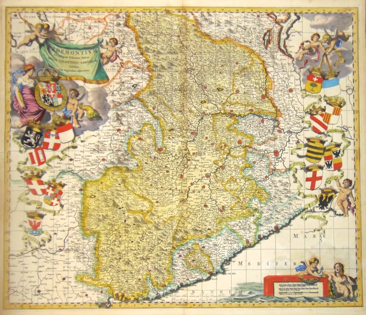 Incisione in rame di Ioannes de Broen, 505x585. Tratta da "Theatrum Sabaudiae". Colorata in buono stato, con qualche strappetto marginale restaurato, leggero alone all'angolo inferiore destro. W. Blaeu, astronomo allievo di Tycho Brahe, fondò un'officina per la costruzione di globi nel 1599; quasi immediatamente iniziò a pubblicare anche carte geografiche, giungendo nel 1630 alla creazione del primo atlante "Atlantis Appendix" e cinque anni dopo, della prima edizione in due tomi del "Atlas Novus". Dopo la sua morte nel 1638, a cura del figlio Johan si giunse nel 1662 alla pubblicazione del celebre "Atlas Maior" in 11 volumi. Nel 1672 un incendio distrusse l'officina e segnò la fine dell'attività.