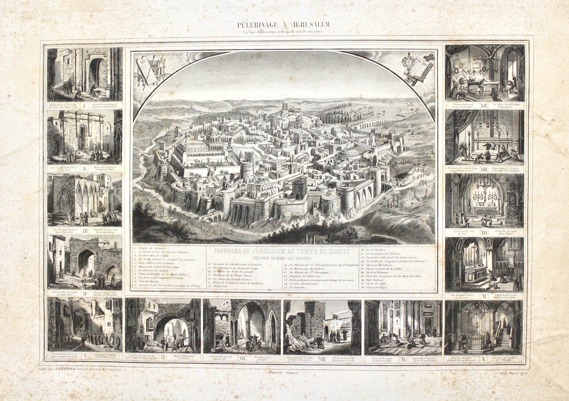 Incisione in rame, mm 325x430. Bella incisione con al centro una veduta di Gerusalemme ai tempi di Gesù con legenda sotto, contornata da 14 vedutine dei luoghi Santi percorsi da Gesù Cristo. Buon esemplare nonostante fioriture e pieghe. Il viaggio a Gerusalemme fu uno dei principali pellegrinaggi della cristianità occidentale, in particolare dopo la caduta della Città Santa nel 1187. Anticamente chi tornava amava sottolineare la pericolosità e l’incertezza di questo viaggio, ma confermava tuttavia l’eccezionale carattere spirituale dei luoghi e delle atmosfere. Il viaggio a Gerusalemme era davvero il migliore di tutti, una forma superlativa di pellegrinaggio; era un obiettivo da raggiungere; la sua diffusione, la sua rappresentatività nelle stampe e nei libri di viaggio ha influenzato il pensiero occidentale.