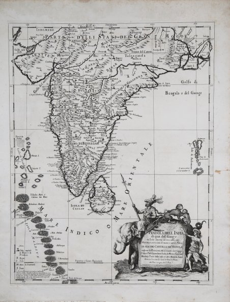 Carta decorativa dell'India, Ceylon, Maldive e regioni limitrofe, realizzata da Giacomo Cantelli da Vignola e pubblicata a Roma da De Rossi. Deriva da fonti del cartografo francese Melchior Tavernier. Carta geografica tratta dal ' Mercurio geografico overo Guida Geografica in tutte le parti del Mondo conforme le Tavole Geografiche del Sansone Baudran de Cantelli Data in luce con direttione, e cura di Gio. Giacomo de Rossi nella sua stamperia ' raccolta di carte edita a Roma tra il 1660 ed il 1730 dalla tipografia De Rossi - la datazione delle carte va dal 1669 al 1715 - la cui prima stesura si deve a Giovanni Giacomo de Rossi. Nel corso degli anni l’atlante fu arricchito da un numero sempre maggiore di carte nelle successive edizioni curate prima da Domenico de Rossi e poi dal figlio Filippo. Il ' Mercurio Geografico ' è una raccolta che raccoglie lavori di cartografi quali Michele Antonio Baudrand, Nicolas Sanson, Augustin Lubin, Filippo Titi, Giacomo Ameti, Giovanni Antonio Magini e Innocenzo Mattei e che ' contempla come "corpus" principale ' la grande produzione del geografo Giacomo Cantelli da Vignola. Le carte sono finemente copiate ed intagliate dai maggiori incisori dell'epoca tra i quali Falda, Widman, Barbey, Widman, Lhuillier, Donia, Mariotti. ' Cantelli era un geografo e cartografo, originario di Montorsello presso Vignola; compiti gli studi umanistici a Bologna, nel 1669, entrò ivi a servizio del marchese Obizzo da Ferrara come segretario, poi passò a Venezia e di là a Parigi, dove strinse rapporti coi maggiori geografi francesi del tempo, il Du Val, Nicola Sanson e specialmente Michel Antoine Baudrand, col quale rimase poi sempre in corrispondenza. Tornato a Bologna, fu per lunghi anni segretario di Rinieri Marescotti; ma, intorno al 1675 o poco dopo, si recò, forse più volte, a Roma, ed entrò in relazione con la celebre officina cartografica dei De Rossi, la quale pubblicò poi la massima parte delle sue carte geografiche. La sua fama di cartografo si era ormai consolidata, tanto che venne chiamato sia dal papa Innocenzo XI che dal duca di Modena e Reggio Francesco II d'Este, che lo desideravano entrambi come cartografo ufficiale. Scelse la corte di Francesco II, e in novembre 1685 fu nominato geografo di corte. Dal 1686 al 1689 eseguì numerose carte di paesi e territori europei. Costruì di sua mano un mappamondo e un globo celeste, che rimasero esposti per qualche tempo nell'atrio della Biblioteca Estense a Modena. Morì in Modena il 30 novembre 1695. Quasi tutte le carte furono inserite nel Mercurio Geografico, il notissimo atlante pubblicato a Roma dai De Rossi. Nella prima edizione del Mercurio Geografico furono pubblicate 19 sue carte, assieme ad altre del Sanson e del Baudrand. Nel 1692 uscì una seconda edizione in due volumi, che conteneva lavori da lui eseguiti (88 carte, intagliate al bulino dall'incisore Antonio Barbey). Incisione in rame, minimo foxing, per il resto in ottimo stato di conservazione. Bibliografia cfr. R. Almagià, ' Studi storici di cartografia napoletana, in “Archivio storico per le province napoletane”, 38 (1913), p. 645; A. Bonazzi, ' Il Mercurio geografico: il gioco e la differenza, in “Giacomo Cantelli: geografo del Serenissimo”, Bologna, 1995, p. 37-44 e 150-152; Bagrow ' 268; ' Phillips ' I 254-255; Shirley BL I, pp. 868-874. Scarce decorative map India, Ceylon, the Maldives and neighboring regions by Cantelli da Vignola and published in Rome by De Rossi. After Melchior Tavernier. The map provides one of the most detailed and up to date treatments of the region. Includes several ornate cartouche.Map taken from ' Mercurio geografico overo Guida Geografica in tutte le parti del Mondo conforme le Tavole Geografiche del Sansone Baudran de Cantelli Data in luce con direttione, e cura di Gio. ' Giacomo de Rossi nella sua stamperia ' collection of maps published in Rome between 1660 and 1730 by the typography De Rossi - the date of the maps goes from 1669 to 1715 - whose first edition is due to Giovanni Giacomo de Rossi. Over the years the atlas was enriched by an increasing number of maps in subsequent editions edited first by Domenico de Rossi and then by his son Filippo. The ' Mercurio Geografico ' is a collection that brings together works by cartographers such as Michele Antonio Baudrand, Nicolas Sanson, Augustin Lubin, Filippo Titi, Giacomo Ameti, Giovanni Antonio Magini and Innocenzo Mattei, and which includes as its main "corpus" the great production of the geographer Giacomo Cantelli da Vignola. The maps are finely copied and engraved by the major engravers of the time including Falda, Widman, Barbey, Widman, Lhuillier, Donia, Mariotti. ' Cantelli was a geographer and cartographer, a native of Montorsello near Vignola; duties his humanistic studies in Bologna, in 1669, he entered the service of Marquis Obizzo da Ferrara there as secretary, then went to Venice and from there to Paris, where he formed relations with the leading French geographers of the time, Du Val, Nicola Sanson and especially Michel Antoine Baudrand, with whom he then remained in constant correspondence. Returning to Bologna, he was for long years secretary to Rinieri Marescotti; but, around 1675 or shortly thereafter, he went, perhaps several times, to Rome, and entered into relations with the famous De Rossi cartographic workshop, which then published most of his maps. By this time his reputation as a cartographer had been established, so much so that he was called upon by both Pope Innocent XI and the Duke of Modena and Reggio Francesco II d'Este, both of whom wanted him as their official cartographer. He chose the court of Francesco II, and in November 1685 he was appointed court geographer. From 1686 to 1689 he executed numerous maps of European countries and territories. He constructed by his own hand a world map and a celestial globe, which remained on display for some time in the atrium of the Biblioteca Estense in Modena. He died in Modena o