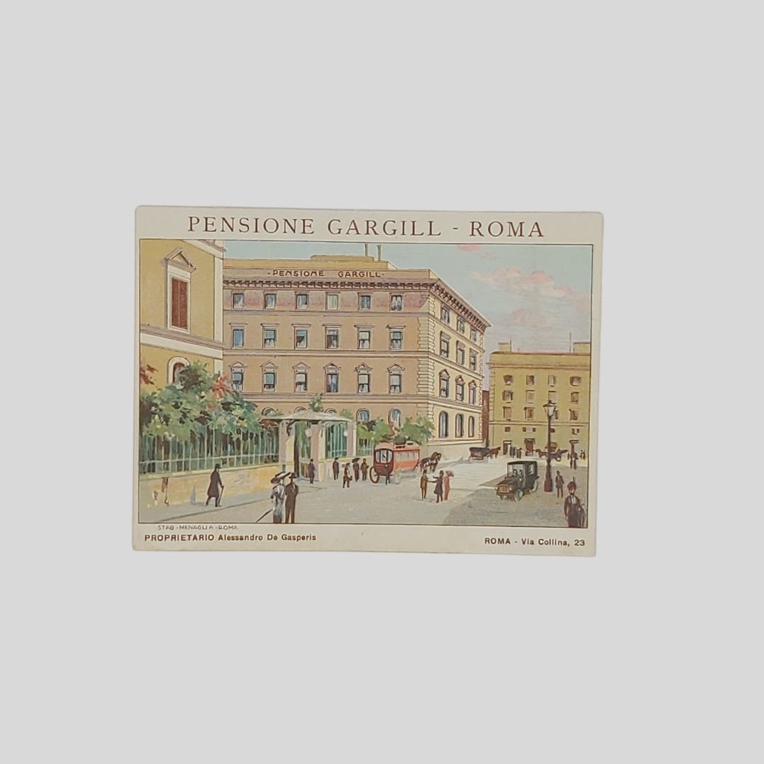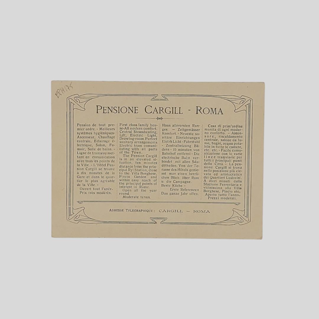 Cartoncino pubblicitario stampato al recto-verso, cm 14x10. In buone condizioni. Refuso tipografico al nome della Pensione "Gargill" anziché "Cargill".<BR><BR>Al verso descrizione in quattro lingue inquadrata in cornice liberty: «Casa di prim'ordine munita di ogni modero conforto. La Pensione Cargill si trova nella posizione più elevata ed aristocratica dei Quartieri Ludovisi. Aperto tutto l'anno. Prezzi moderati. Proprietario Alessandro De Gasperis. Via Collina, 23 - Roma». .<BR><BR>Albergo ancora esistente con insegna Art’otel (già Londra & Cargill)