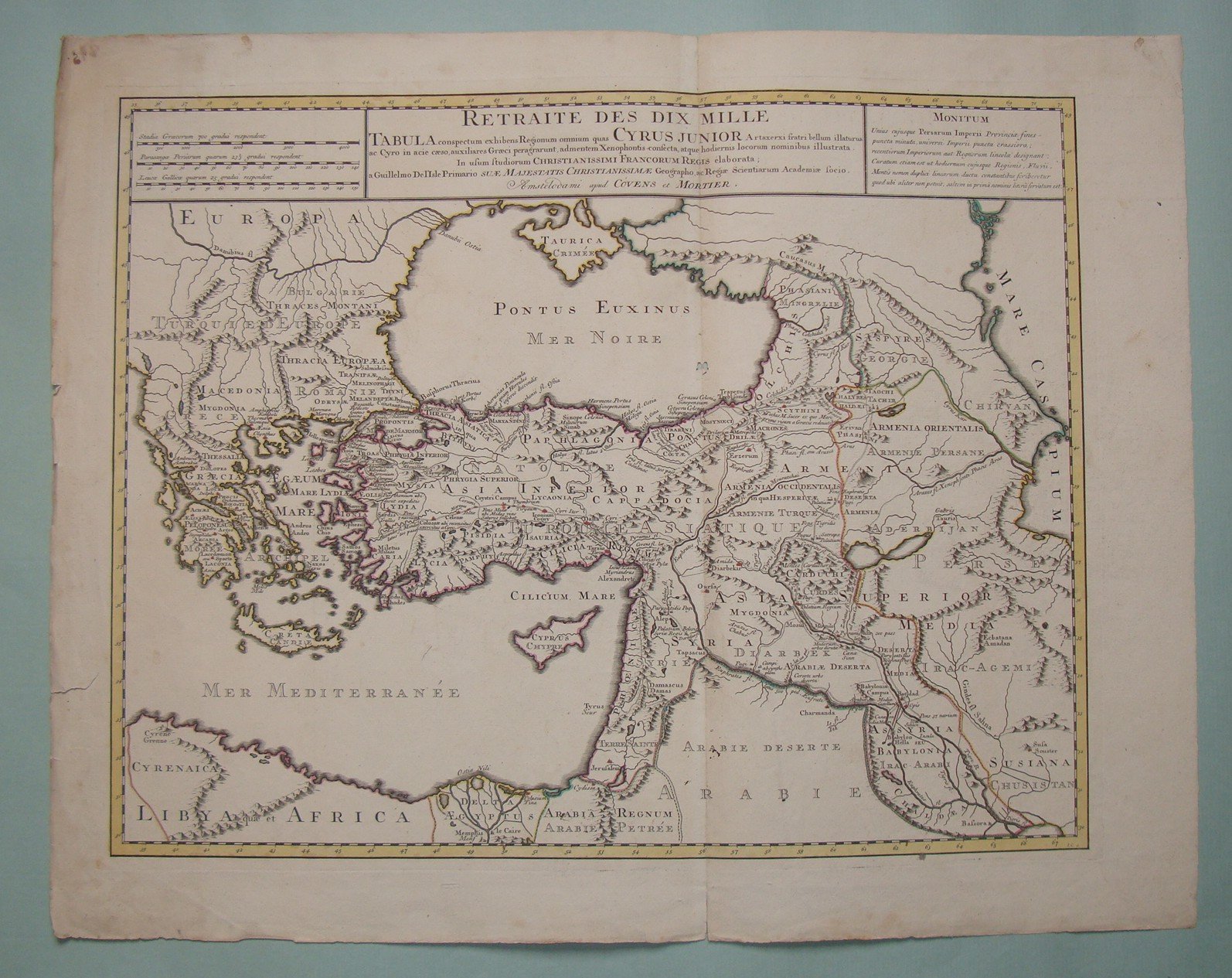 Amsterdam, 1750 ca. Amstelolodami apud Covens et Mortier, a Guillelmo Del'Isle Primario Suae Majestatis Christianissimae Geographo . Double page engraved map. Contemp. hand coloured in outline. Inches 17 1/2 x 22 1/2 (Cm. 45x57).