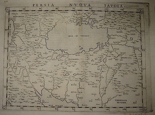 Incisione originale su rame (cm. 24,5x19,5 più margini bianchi) tratta da ‘La Geografia di Claudio Tolomeo’. Ottimo esemplare.