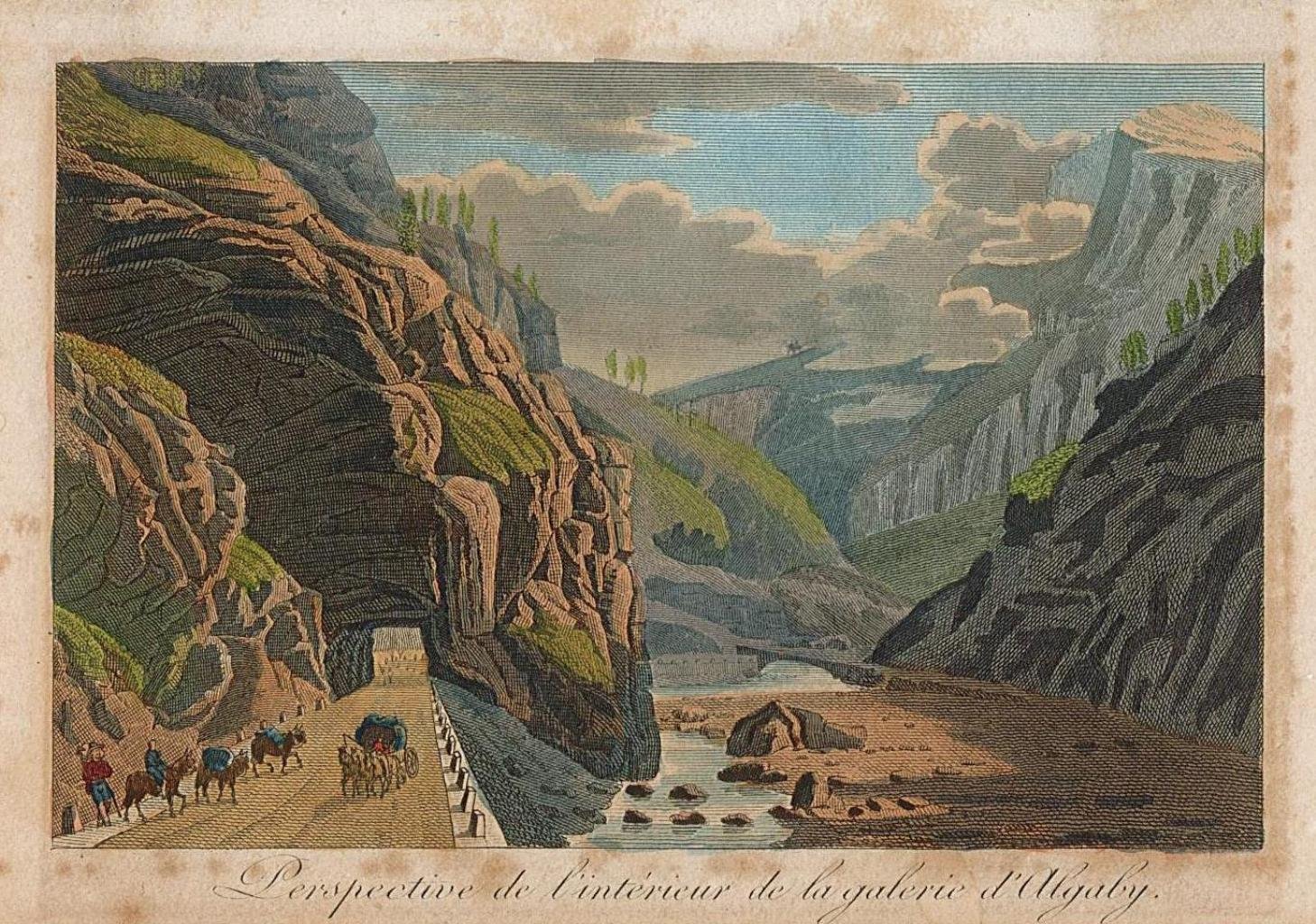 Incisione, antica ed originale, raffigurante l'ingresso della galleria lungo la strada del Sempione. Autore: Lory Gabriel dis. & Louis Janet edit. Luogo: Sempione. Anno: 1820 ca. Tecnica: incisione in rame. Dimensioni: 68x106.