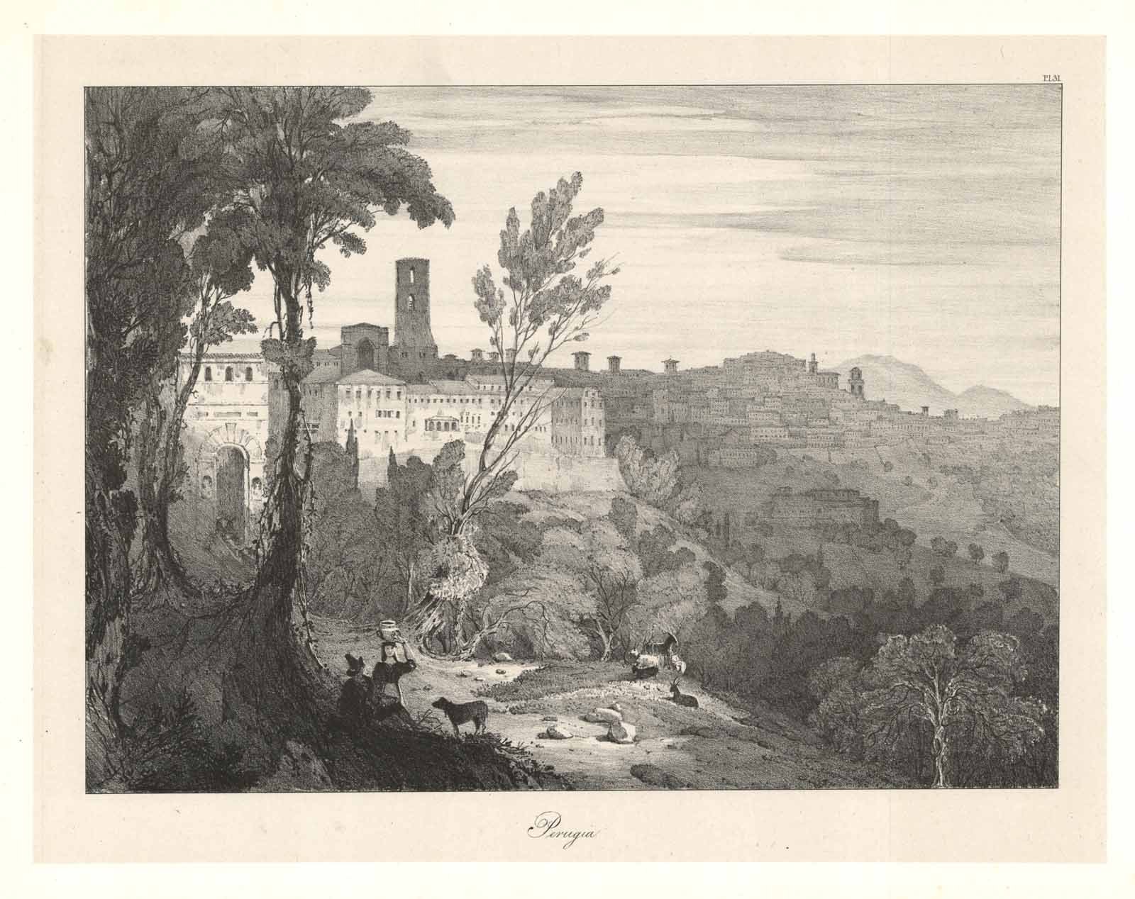 Perugia, the capital of Umbria, is a large, well-built, but gloomy-looking city, perched, like many other Italian cities, upon the summit of one of a range of hills.It has a very imposing appearence when viewed from near the Roman entrance. The prospect from the summit, and from parts of the city. toward the valley of Spoleto, is very beautiful.Litografia, stampata su carta della cina, tratta da un disegno di William Linton eseguito durante il suo tour in Italia negli anni 1828 e 1829. "In order to preserve perfectly the fidelity, spirit, and character of the originals, which were taken in pencil, they will be repeated in the same free and sketchy style by Drawings executed by himself, on Stone". L'opera, in cui si trova inserita la veduta, "Sketches in Italy: Being a selection." dedicata a Sua Maestà William IV è da considerarsi una delle più importanti del Grand Tour del XIX prodotta da un artista inglese; uscì in dodici fascicoli, ciascuno contenente 8 illustrazioni, pubblicati ogni due mesi.Ottimo stato di conservazione. RaraRif: Cassano, vol. I, p. 260Linton William (1791-1876) Il suo stile e la sua opera furono influenzati da Richard Wilson, il grande paesaggista gallese (1714-1782), per l'ampia composizione panoramica, nonché dall'opera di Claude Lorrain (1600-1682), di cui studiò gli effetti della luce naturale, e da Claude-Joseph Vernet (1714-1789), per la sua idealizzazione del classicismo. Nel 1817 si stabilì a Londra ed espose alla Royal Academy e alla British Institution. Nel 1823-24 ebbe parte attiva nella fondazione della Society of british Artists, della quale fu anche presidente nel 1837. Nel 1828-29 effettuò il lungo viaggio da cui scaturì la pubblicazione in due volumi in cui è inserita la presente veduta. Alcuni anni più tardi ne compì uno ancor più lungo nel Mediterraneo, visitò la Grecia, da cui scaturì l'opera "The scenery of Greece and its islands", edita nel 1850, la Sicilia, ancora il sud dell'Italia e il sud della Francia. Il risultato di questi viaggi fu un grande numero di schizzi e disegni che costituirono la base per i suoi dipinti di paesaggi di grandi dimensioni; per tale motivo fu definito "il nuovo Richard Wilson" e fu messo in comparazione con un altro grande artista del suo tempo: J.M.W. Turner. Il British Museum e la Tate Gallery conservano tra le sue opere anche quadri di vedute italiane.Rif: Vescarelli, p. 238; Benezit, Dictionnaire des Peintre…; Grant, A Dictionary of British Landscape Painters.