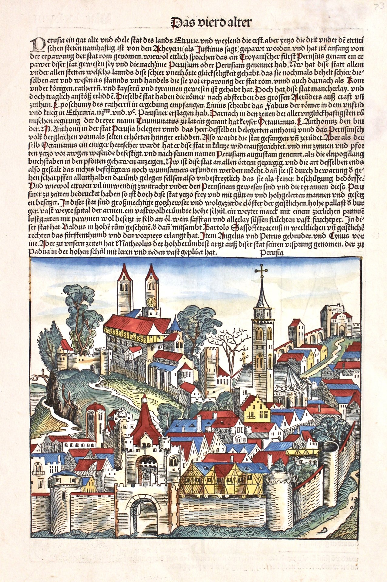 Silografia, mm 190x225 la sola incisione, mm 298x430 il foglio, dipinta a mano (la veduta di Perugia, mentre è in bianco e nero il verso). Veduta fantastica della città di Perugia. Al verso una veduta del Tempio di Salomone a Gerusalemme, sotto inoltre 9 immagini con re, profeti e un vescovo. La veduta è inserita nella parte inferiore del foglio, il testo descrittivo in alto, rubricato in rosso. Tratta da una edizione tedesca del “Liber Chronicarum” di Schedel, comunemente chiamato “Cronaca di Norimberga”: fu la prima opera con raffigurazioni reali delle città del mondo (circa 2000 silografie) ed ebbe un enorme successo, tale da essere considerata una pietra miliare nello sviluppo della conoscenza geografica. Fu stampato in due edizioni, la prima latina nel luglio 1493 in circa 1500 copie, la seconda, tedesca, in dicembre dello stesso anno, in circa 800 esemplari. Le incisioni sono opera di Michael Wohlgemuth, maestro di Albrecht Duerer, del figliastro Wilhelm Pleydenwurff e del giovane Duerer stesso. Walter L. Strauss nel testo Woodcuts and woodblocks (New York: Abaris book, 1980) attribuisce appunto alcune xilografie al giovane artista. Buon esemplare con antico rinforzo ad un angolo Ottimo esemplare.