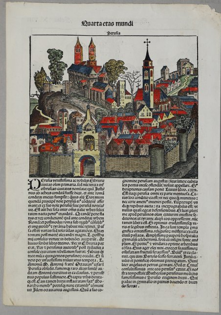 Veduta fantastica tratta da una edizione latina di âLiber Chronicarumâ, una delle primissime opere illustrate pubblicate, che ebbe un enorme successo. La veduta è inserita nella parte superiore del foglio, mentre in basso si trova il testo descrittivo. La monumentale opera di Schedel, il Liber Cronicarum, rappresenta uno âdei più straordinari lavori mai realizzatiâ dallâeditoria del XV secolo. Gli incisori erano Michael Wolgemut, famoso maestro di Albrecht Dürer, e il figliastro Wilhelm Pleydenwurff. Wolgemut fu il tutore di Albrecht Dürer tra il 1486 e il 1490; recenti studi hanno dimostrato come Durer abbia collaborato alla realizzazione di questâopera, poiché alcuni dei tratti hanno somiglianze stupefacenti con quelli dellâApocalisse; alcune opere sono infatti attribuite al maestro di Norimberga. La stampa venne supervisionata dal grande stampatore Anton Koberger, le cui opere erano famose in tutta Europa. Xilografia, finemente colotrata a mano, in ottimo stato di conservazione.