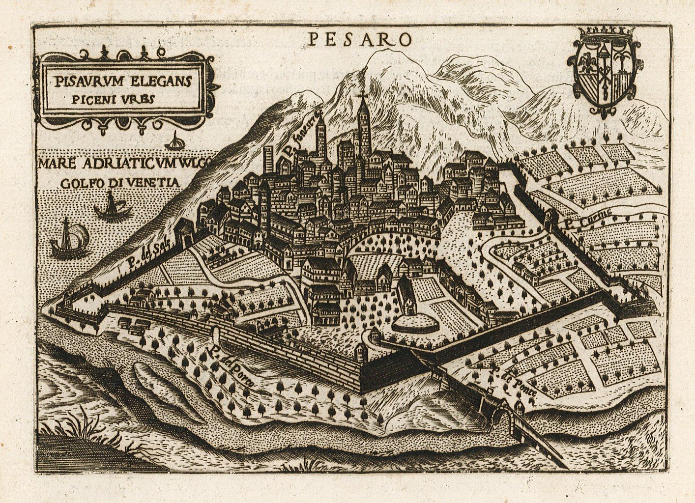 Stampa, antica ed originale, con veduta planimetrica prospettica della città. Autore: Bertelli Francesco. Luogo: Pesaro. Anno: 1629. Tecnica: incisione in rame. Dimensioni: 120x169 mm. in allegato due pagine di testo descrittivo