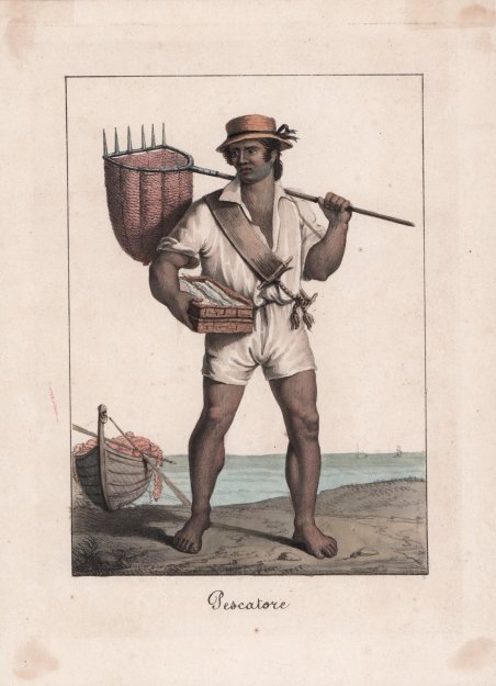 Costume popolare napoletano raffigurante il pescatore, prima metà del XIX secolo. Appartiene ad un’anonima suggestiva e non comune raccolta di 48 tavole eseguite in litografia e finemente miniate a mano all’epoca “a la gomme”. Le tavole raffigurano diverse situazioni di vita e mestieri: è presente Pulcinella, il mangia maccheroni, l’acquavitaio, il pescatore, lo zampognaro, la danzatrice di tarantella, donne nei costumi locali di Napoli, Procida, Salerno, Teramo, Aquila, Caraffa di Catanzaro, Teramo, Lecce, Ustica, Trapani, Capri, Pizzo Calabro, ecc. Litografia, con coloritura coeva, in ottimo stato di conservazione. Costume popolare napoletano raffigurante il pescatore, prima metà del XIX secolo. Appartiene ad un’anonima suggestiva e non comune raccolta di 48 tavole eseguite in litografia e finemente miniate a mano all’epoca “a la gomme”. Le tavole raffigurano diverse situazioni di vita e mestieri: è presente Pulcinella, il mangia maccheroni, l’acquavitaio, il pescatore, lo zampognaro, la danzatrice di tarantella, donne nei costumi locali di Napoli, Procida, Salerno, Teramo, Aquila, Caraffa di Catanzaro, Teramo, Lecce, Ustica, Trapani, Capri, Pizzo Calabro, ecc. Litografia, con coloritura coeva, in ottimo stato di conservazione. Cfr.