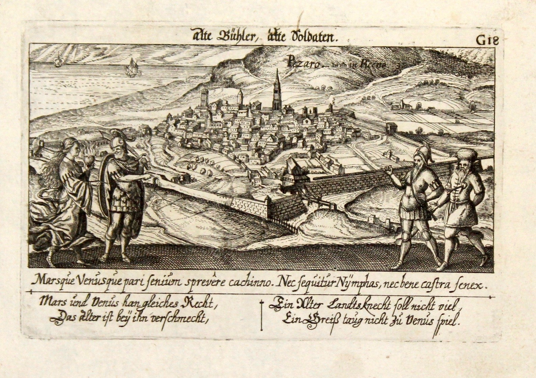 Incisione in rame, dipinta a mano d'epoca, 280x395, eseguita su soggetto di Georg Hoefnagel; testo latino al verso; tratta da "Theatrum praecipuarum urbium". Bell' esemplare nella usuale coloritura piuttosto ossidata; accuratamente rinforzato in due punti con carta cina al retro e foderata con un velo di carta cina protettiva.