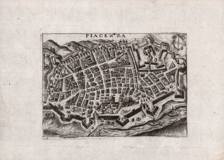 Pianta della città ' ' tratta dal rarissimo ' Teatro della Guerra diviso in XXXXVIII parti ' di Vincenzo Coronelli, edito a Venezia (sebbene nel frontespizio sia indicato Torino) tra il 1706 ed il 1709. In particolare, questa mappa è contenuta in: "Lombardia ch'abbraccia gli Stati de' duchi di Savoja, Mantova, Parma, e Modona, e del Milanese, Descritti dal P. Coronelli", Jo. Batt. de Rossi in piazza Navona excud, Torino 1706. La raccolta comprende centinaia di vedute, carte geografiche e nautiche di tutte le parti del mondo. Come scrive Ermanno Armao, grande studioso del Coronelli, “non è facile stabilire quanti e quali sono i volumi che compongono la raccolta". Secondo Augusto De Ferrari (cfr. Dizionario Biografico degli Italiani - Volume 29, 1983): “il ' Teatro della guerra ' era previsto in quarantotto volumi, ma ne uscirono solo ventisette a Venezia tra il 1706 e il 1709, anche se recano diverse indicazioni, ed intendeva essere una descrizione geografica degli Stati coinvolti nella guerra di successione spagnola, con poche pagine di testo e molte tavole (circa duemila), non tutte originali”. ' Alcune carte derivano da quelle già incluse nel testo dell'Isolario ' del 1696, con alcune varianti – spesso nella dedica. La maggior parte delle vedute viene tuttavia realizzata appositamente per l'opera. Acquaforte, in perfetto stato di conservazione. ' Carta molto rara. Map taken from the rare ' Teatro della Guerra diviso in XXXXVIII parti ' by Coronelli published in Venice (although the title page is indicated Torino) between 1706 and 1709. In particular this map is contained in the chapter titled "Lombardia ch'abbraccia gli Stati de' duchi di Savoja, Mantova, Parma, e Modona, e del Milanese, Descritti dal P. Coronelli", Jo. Batt. de Rossi in piazza Navona excud, Torino 1706. The collection includes hundreds of views, maps and nautical charts of all parts of the world. As Ermanno Armao, a great scholar of Coronelli, writes, it is not easy to establish how many and which are the volumes that make up the collection. According to Augusto De Ferrari (cf. Dizionario Biografico degli Italiani - Volume 29, 1983) the ' Teatro della Guerra diviso in XXXXVIII parti ' was planned in forty-eight volumes, but only twenty-seven were published in Venice between 1706 and 1709, even if they bear different indications, and was intended to be a geographical description of the States involved in the War of the Spanish Succession, with few pages of text and many plates (about two thousand), not all of them original". Some maps derive from those already included in the text of the ' Isolario ' of 1696, with some variations - often in the dedication. Most of the views, however, are made specifically for the work. Copper engraving, in perfect condition. Cfr.