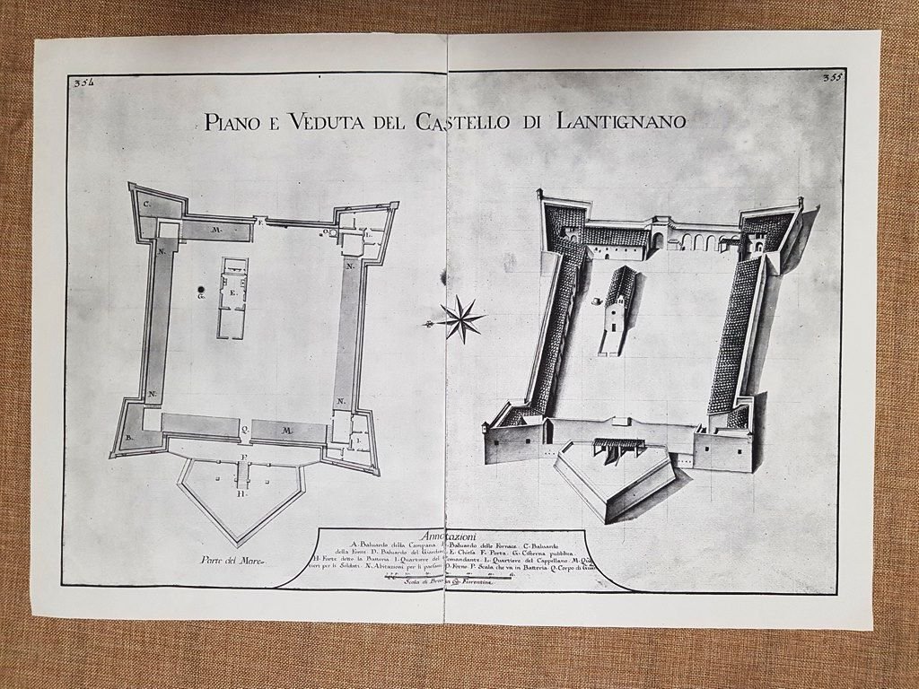 Piano e veduta Castello di Lantignano Granducato di Toscana Warren 1749 Ristampa