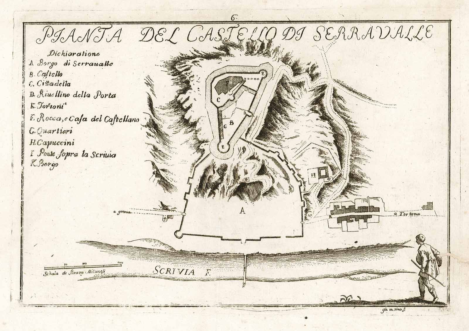 Pianta planimetrica della città di Serravalle con evidenziate le mura a protezione del borgo e del castello. Sulla sinistra rimandi da A a K. Sulla destra restauro antico di segno di tarlo