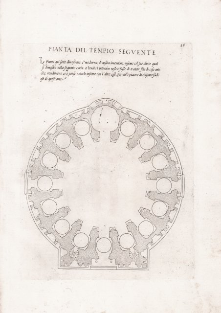 Tavola tratta dal Libro D'Antonio Labacco Appartenente A L'Architettura, Nel Qual Si Figurano Alcuni Notabili Antiquita Di Roma di Antonio Labacco, stampato per la prima volta nel 1552. Il Libro D'Antonio Labacco Appartenente A L'Architettura è un'opera importante per lo studio dell'architettura classica e uno dei primi trattati di architettura illustrati con lastre di rame, al posto delle xilografie e del testo a stampa. L'autore trovò il mezzo dell'incisione su rame di gran lunga superiore alla tradizionale immagine xilografica, consentendo una maggiore precisione e realismo. Questo libro presenta belle e accurate ricostruzioni di antichi monumenti romani come l'Arco e il Foro di Traiano, il Tempio di Castore e Polluce, il Mausoleo di Adriano (oggi noto come Castel Sant'Angelo), il Porto di Traiano e diversi templi senza nome, sulla base di descrizioni ricavate da testi classici e dall'ispezione delle loro rovine. Labacco (1495-1567?), architetto italiano e frequente collaboratore di Antonio da Sangallo il Giovane in progetti come la Basilica di San Pietro, verso la fine del pontificato di Paolo III (1549), decise di pubblicare le sue ' Antiquità ' e ottenne dal pontefice il privilegio per la pubblicazione. Nel 1552 fu edito il ' Libro appartenente a l'architettura nel qual si figurano alcune notabili antiquità di Roma, "Impresso in Roma in casa nostra". Nell'introduzione "alli Lettori" il Labacco comunicava di essere "stato più volte persuaso da Mario", suo figlio, che "fusse bene" mettere parte delle stampe "in luce" offrendosi egli stesso "infin all'intagliar parte d'esse". Mario avrebbe quindi inciso parte dei disegni del Labacco e ciò è plausibile visto che esercitava il mestiere di intagliatore in rame. Vasari, parlandone nella vita di Marcantonio Bolognese, dice che "Antonio Abbaco ha mandato fuori con bella maniera tutte le cose di Roma antiche e notabili, con le lor misure, fatte con intaglio sottile, e molto ben condotte". Non si conoscono esemplari antecedenti, ma di certo numerose copie furono in circolazione molto prima, soprattutto a seguito del privilegio già concessogli quasi sicuramente nel 1547 da Paolo III. Il ' Libro, contenente la riproduzione in incisione di alcuni monumenti di Roma antica impiegando i diversi sistemi di rappresentazione (piante, prospetti e sezioni), ebbe molta fortuna e fu più volte ristampato (nel 1557 la seconda edizione; nel 1559 la terza; poi ancora negli anni 1568-70), non sempre con cura e precisione, anche dopo l'ultimo privilegio concesso da Paolo IV. Labacco abitava nel rione Campo Marzio; la sua ultima residenza fu però nel rione Ponte dove abitava già dal 26 luglio 1539, presso la parrocchia di S. Salvatore "in Banchi". Fra l'altro risulta che proprio qui egli avesse impiantato la stamperia per le "impressure" delle tavole del ' Libro. Acquaforte e bulino, impressa su carta vergata priva di filigrana, con margini, in ottimo stato di conservazione. Bibliografia T. Ashby, ' Il libro d'Antonio Labacco appartenente all'architettura, in “La Bibliofilia”, 16 (1914), pp. 289-309; Flavia Colonna – Antonio Labacco, in “Dizionario Biografico degli Italiani” - Volume 62 (2004). Plate taken from the Libro D'Antonio Labacco Appartenente A L'Architettura, Nel Qual Si Figurano Alcune Notabili Antiquita Di Roma by Antonio Labacco, first printed in 1552. The Libro D'Antonio Labacco Appartenente A L'Architettura, is an important work in the study of classical architecture and one of the earliest architectural treatises illustrated with copper plates, in place of woodcuts and printed text. The author found the medium of copper engraving far superior to the traditional woodcut image, allowing for greater precision and realism. This book presents beautiful and accurate recreations of ancient Roman monuments such as the Arch and Forum of Trajan, the Temple of Castor and Pollux, the Mausoleum of Hadrian (now known as the Castel Sant’Angelo), Trajan’s Harbor, and several unnamed temples, based on descriptions gleaned from classical texts and the inspection of their ruins. Labacco (1495-1567?), Italian architect and frequent collaborator with Antonio da Sangallo the Younger on projects such as St. Peter’s Basilica, near the end of the pontificate of Paul III (1549), he decided to publish his Antiquities and obtained from the pontiff the privilege for publication. In 1552 the Libro appartenente a l'architettura nel quale si figurano alcune notabili antiquità di Roma, "Impresso in Roma in casa nostra," was published. In the introduction "alli Lettori" Labacco communicated that he had "been persuaded several times by Mario," his son, that "fusse bene" to put part of the prints "in light" offering himself "infin all'intagliar parte d'esse." Mario would therefore have engraved part of Labacco's drawings, and this is plausible given that he practiced the trade of copperplate engraver. Vasari, speaking of him in the life of Marcantonio Bolognese, says that "Antonio Abbaco has sent out with beautiful manner all the ancient and notable things of Rome, with their measures, made with subtle carving, and very well conducted." No earlier examples are known, but certainly numerous copies were in circulation much earlier, especially following the privilege already almost certainly granted to him in 1547 by Paul III. The Book, containing the reproduction in engraving of some monuments of ancient Rome employing the different systems of representation (plans, elevations and sections), was very successful and was reprinted several times (in 1557 the second edition; in 1559 the third; then again in the years 1568-70), not always with care and accuracy, even after the last privilege granted by Paul IV. Labacco lived in the Campo Marzio district; his last residence, however, was in the Ponte district where he lived as early as July 26, 1539, at the parish of S. Salvatore "in Banchi." Among other things, it appears that it was here that he had establishe