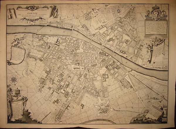 Incisione originale su rame (cm. 68,5x51 più margini bianchi). Carta filigranata. Margine superiore bianco ricostruito, altrimenti esemplare in ottimo stato di conservazione e di assoluta freschezza. Prima tiratura assai rara che, a differenza delle successive ristampe, presenta entro il cartiglio in alto a destra, la dedica a V.A.R. (Gian Gastone de’ Medici Granduca di Toscana) e lo stemma mediceo. In altri quattro cartigli è indicato il numero di chiese curate e senza cure, monasteri, oratori, conservatori, ospedali, accademie, compagnie militari e teatri del quartiere corrispondente.