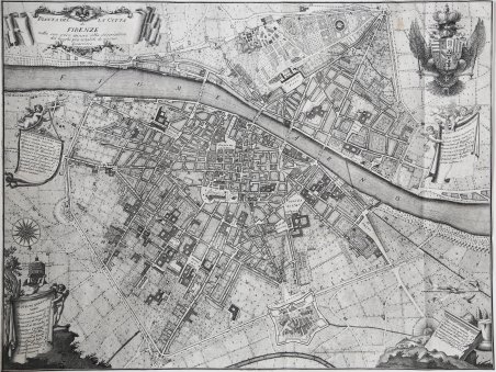 In alto a sinistra in un cartiglio il titolo: basso a sinistra, all’interno di un cartiglio: ' PIANTA DELLA CITTA’ DI FIRENZE nelle sue vere misure colla descrizione dei luoghi più notabili di ciascun Quartiere. Sotto, quattro cartelle. Sopra quella a sinistra: ' ARME DEL QUARTIEre SANTA CROCE. Dentro:IN QUESTO QUARTIERE SONO: Chiese curate numero….13./ Chiese senza cura num[e]ro….2./ Monasteri di Regolari n[ume]ro…7./ Monasteri di Monache n[ume]ro 16./ Oratorij, e Compagnie num[er]o 46./ Conservatorij di Maschi n[umer]o 2./ Conservat[o]ri di Femmine n[ume]ro…1/ Spedali per gl’Infermi n[umer]o/ Spedali per i Pellegrini 2./ Accademie numero….1./ Teatri numero….1. ' Sopra quella a destra: ' ARME DEL QUAR[TIE]re SANTO SPIRITO. ' Dentro: ' IN QUESTO QUARTIERE SONO: Chiese curate numero.9/ Chiese senza cura n[ume]ro.2/ Monasteri di Regol[ari] n[umer]o 7/ Monasteri di Monache ' n[umer]o 12/ Oratorij, e Compagnie ' n[umer]o ' 34/ ' Conservat[o]ri di Femm[i]ne ' n[umer]o ' 1/ ' Spedali per i Pellegrini ' n[ume]ro 5. Sopra quella a sinistra in basso: ' ARME DEL QUARTIEre S.GIOVANNI. Dentro: ' IN QUESTO QUARTIERE SONO: Chiese curate numero.10/ Chiese senza cura n[ume]ro.7/ Monasteri di Regol[ari] n[umer]o 6/ Monasteri di Monache. 21/ Oratorij, e Compagnie 40/ Conservat[o]rij di Mas.chi …2./ Conservat[o]ri di Femm[i]ne 3/ Sped[a]li per gl’Infermi n[umer]o 4/ Sped[a]li per i Pellegrini 3/ Accademie num[e]ro….6./ Teatri numero….2. ' Accanto a quella a destra in basso: ' ARME DEL QUARTIEre S.MA[R]ia NOVELLA. Dentro: ' IN QUESTO QUARTIERE SONO: Chiese curate numero….17./ Chiese senza cura num[e]ro… 2./ Monasteri di Regolari n[umer]o 9/ Monasteri di Monache n[umer]o 8/ Oratorij, e Compagnie n[ume]ro 42/ Spedali per gl’Infermi n[umer]o 2./ Spedali per i Pellegrini n[ume]ro 1. Sul nastro che contiene la scala: ' Scala di Passi Seicento comuni. All’interno numerosi nomi delle emergenze, dei corsi d’acqua e delle strade e piazze. Sotto fuori dal quadro: ' Appresso Giuseppe Bouchard in Firenze 1755. ' Si tratta di una riedizione della pianta Ruggieri del 1731, in cui alla cartella dedicatoria è stata sostituita l’aquila dei Lorena. Il foglio contiene, entro una marginatura doppia, la pianta della città. L’apparato decorativo è costituito dal cartiglio che contiene il titolo, dal nastro che contiene la scala e dalle quattro cartelle che contengono le informazioni sui quartieri: tre sono in forma di stendardo sorretto da putti alati, la quarta in forma di cippo. L’orientamento, 190° sud in alto, è dato da una rosa dei venti col vertice gigliato. è questa la prima accurata restituzione geometrica a stampa dello sviluppo planimetrico delle strutture urbane, in cui si distinguono nettamente gli spazi scoperti e quelli costruiti. Nei primi è rappresentato il disegno dei principali orti e giardini; nei secondi diverse campiture segnalano la qualità dell'edilizia: a tratteggio inclinato più scuro gli edifici di maggior rilievo, con puntinatura l'edilizia comune, con una X su fondo bianco i cortili interni. Sono messi in evidenza con grafia differenziata a tratteggio i complessi monumentali. Le chiese e Palazzo Pitti sono indicate con il disegno delle coperture che fornisce una connotazione volumetrica all’interno della piatta campitura dell’isolato. La puntuale scrittura dei nomi delle strade e delle piazze rende questa pianta antesignana delle piante turistiche. ' Acquaforte, impressa su carta vergata coeva, rifilata alla linea marginale, in ottimo stato di conservazione. Esemplare “da viaggio” con numerose pieghe di carta. Bibliografia Boffito, Mori, Firenze nelle vedute e piante 1973, p.78. Top left in a cartouche the title: lower left, within a cartouche: PIANTA DELLA CITTA’ DI FIRENZE nelle sue vere misure colla descrizione dei luoghi più notabili di ciascun Quartiere. Below, four folders. Above the one on the left: ARME DEL QUARTIEre SANTA CROCE. Dentro:IN QUESTO QUARTIERE SONO: Chiese curate numero….13./ Chiese senza cura num[e]ro….2./ Monasteri di Regolari n[ume]ro…7./ Monasteri di Monache n[ume]ro 16./ Oratorij, e Compagnie num[er]o 46./ Conservatorij di Maschi n[umer]o 2./ Conservat[o]ri di Femmine n[ume]ro…1/ Spedali per gl’Infermi n[umer]o/ Spedali per i Pellegrini 2./ Accademie numero….1./ Teatri numero….1. ' Above the one on the right: ARME DEL QUAR[TIE]re SANTO SPIRITO. ' And: ' IN QUESTO QUARTIERE SONO: Chiese curate numero.9/ Chiese senza cura n[ume]ro.2/ Monasteri di Regol[ari] n[umer]o 7/ Monasteri di Monache ' n[umer]o 12/ Oratorij, e Compagnie ' n[umer]o ' 34/ ' Conservat[o]ri di Femm[i]ne ' n[umer]o ' 1/ ' Spedali per i Pellegrini ' n[ume]ro 5. Above the one on the left at the bottom: ARME DEL QUARTIEre S.GIOVANNI. Dentro: ' IN QUESTO QUARTIERE SONO: Chiese curate numero.10/ Chiese senza cura n[ume]ro.7/ Monasteri di Regol[ari] n[umer]o 6/ Monasteri di Monache. 21/ Oratorij, e Compagnie 40/ Conservat[o]rij di Mas.chi …2./ Conservat[o]ri di Femm[i]ne 3/ Sped[a]li per gl’Infermi n[umer]o 4/ Sped[a]li per i Pellegrini 3/ Accademie num[e]ro….6./ Teatri numero….2. ' Next to the one on the right at the bottom: ' ARME DEL QUARTIEre S.MA[R]ia NOVELLA. Dentro: ' IN QUESTO QUARTIERE SONO: Chiese curate numero….17./ Chiese senza cura num[e]ro… 2./ Monasteri di Regolari n[umer]o 9/ Monasteri di Monache n[umer]o 8/ Oratorij, e Compagnie n[ume]ro 42/ Spedali per gl’Infermi n[umer]o 2./ Spedali per i Pellegrini n[ume]ro 1. On the ribbon containing the scale: Scala di Passi Seicento comuni. Below, just outside the picture: Appresso Giuseppe Bouchard in Florence 1755 (here trimmed). This is a reissue of the Ruggieri map of 1731, in which the dedicatory folder has been replaced by the eagle of Lorraine. The sheet contains, within a double margin, the plan of the city. The decorative apparatus consists of the cartouche containing the title, the ribbon containing the scale, and the four folders containing information about t