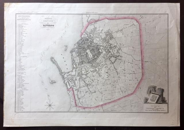 Tratta dall’atlante “Atlante geografico, fisico - storico, corografico dell’Italia”, Firenze, 1842 – 1845. Incisione su acciaio, b/n (confine in rosa, in colore d’epoca), cm 38,5 x 60 (il foglio). Indicazione delle principali località con legenda a 87 voci. Minuscole macchioline di foxing all'estremità esterna dei margini bianchi, buona conservazione.