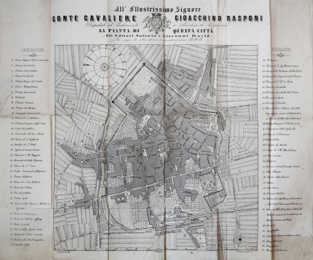 Pianta di Ravenna disegnata da Andrea Saporetti nel 1864 per la litografia Passuli e pubblicata da Antonio e Giovanni David. In alto troviamo la dedica a Gioacchino Rasponi Murat: All'illustrissimo Signore Conte Cavaliere Gioacchino Rasponi. Deputato al Parlamento e Sindaco di Ravenna. LA PIANTA DI QUESTA CITTA’. Gli Editori Antonio e Giovanni David in segno di alta stima e considerazione D.D.D. Ai lati una legenda numerica di 67 rimandi. Gioacchino Rasponi Murat (Trieste, 8 maggio 1829 – Forlimpopoli, 10 settembre 1877) è stato un politico e patriota italiano. Era il figlio primogenito del conte Giulio Rasponi e della principessa Luisa Giulia Murat, a sua volta figlia di Gioacchino Murat e di Carolina Bonaparte, sorella di Napoleone. Fu sindaco di Ravenna dal 1863 al 1865, e nel 1873, anno in cui fu nominato prefetto di Palermo. L'anno seguente tornò a Ravenna dove fondò il Monitore delle Romagne, giornale di ispirazione progressista. Già presidente della Società Operaia di Mutuo Soccorso Maschile, nel 1874 istituì una Società Operaia di Mutuo Soccorso Femminile, una delle prime in Italia. Ricoprì i ruoli di Deputato di Ferrara al Parlamento del Regno d'Italia, Vice Presidente della Camera dei deputati. Massone, non si sa dove e quando è stato iniziato, ma fu eletto membro del Grande Oriente d'Italia alla Costituente massonica di Napoli del 21 giugno 1867 e da quell'anno al 1872 fu Maestro venerabile della Loggia Dante Alighieri di Ravenna. Litografia, impressa su carta coeva e più volte ripiegata in brossura coeva, in buono stato di conservazione. Rara. Pianta di Ravenna disegnata da Andrea Saporetti nel 1864 per la litografia Passuli e pubblicata da Antonio e Giovanni David. In alto troviamo la dedica a Gioacchino Rasponi Murat: All'illustrissimo Signore Conte Cavaliere Gioacchino Rasponi. Deputato al Parlamento e Sindaco di Ravenna. LA PIANTA DI QUESTA CITTA’. Gli Editori Antonio e Giovanni David in segno di alta stima e considerazione D.D.D. Ai lati una legenda numerica di 67 rimandi. Gioacchino Rasponi Murat (Trieste, 8 maggio 1829 – Forlimpopoli, 10 settembre 1877) è stato un politico e patriota italiano. Era il figlio primogenito del conte Giulio Rasponi e della principessa Luisa Giulia Murat, a sua volta figlia di Gioacchino Murat e di Carolina Bonaparte, sorella di Napoleone. Fu sindaco di Ravenna dal 1863 al 1865, e nel 1873, anno in cui fu nominato prefetto di Palermo. L'anno seguente tornò a Ravenna dove fondò il Monitore delle Romagne, giornale di ispirazione progressista. Già presidente della Società Operaia di Mutuo Soccorso Maschile, nel 1874 istituì una Società Operaia di Mutuo Soccorso Femminile, una delle prime in Italia. Ricoprì i ruoli di Deputato di Ferrara al Parlamento del Regno d'Italia, Vice Presidente della Camera dei deputati. Massone, non si sa dove e quando è stato iniziato, ma fu eletto membro del Grande Oriente d'Italia alla Costituente massonica di Napoli del 21 giugno 1867 e da quell'anno al 1872 fu Maestro venerabile della Loggia Dante Alighieri di Ravenna. Litografia, impressa su carta coeva e più volte ripiegata in brossura coeva, in buono stato di conservazione. Rara. Cfr.
