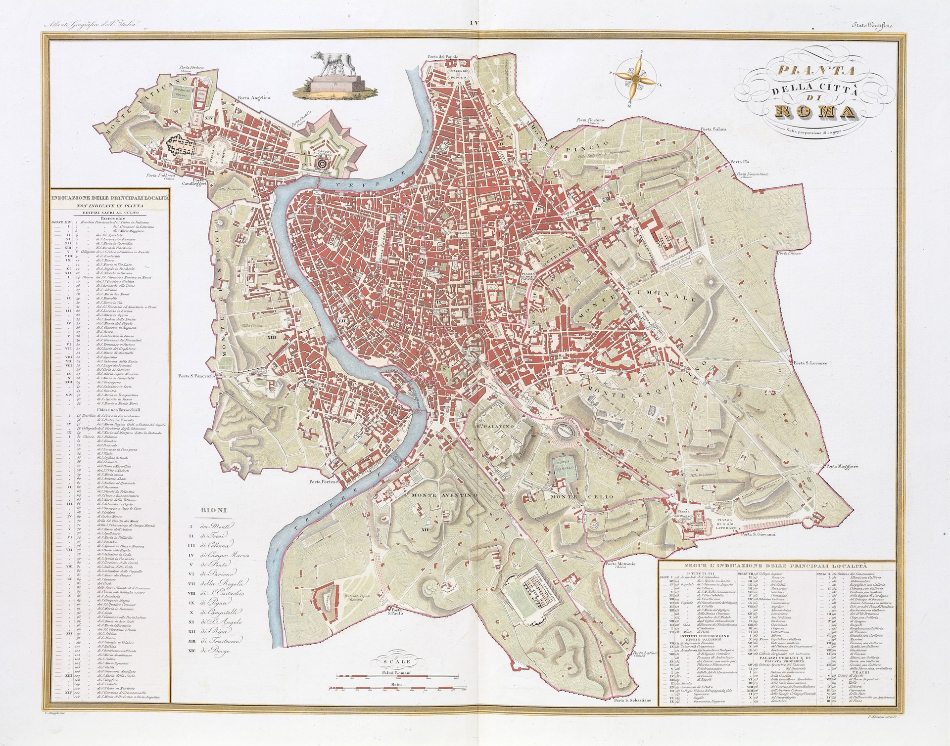 Incisione in rame di Valerio Stanghi, mm 530x670, dipinta a mano. Da Atlante geografico dell’Italia. Attilio Zuccagni-Orlandini (1784-1872) fu un cartografo e geografo italiano. La sua opera principale è senza dubbio la Corografia fisica, storica e statistica dell’Italia e delle sue isole, cui l’incisione appartiene. La Corografia si compone di dodici tomi (senza contare i vari supplementi), stampati tra il 1833 e il 1845, ed è corredata da un atlante in due volumi e da numerose mappe geografiche e topografiche, nonché da tavole illustrative.