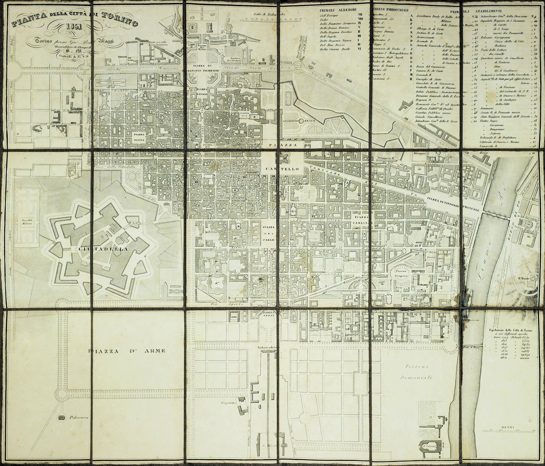 Bella pianta di Torino in bianco e nero (cm. 46,3 x 54,5), telata e suddivisa in 18 riquadri. Sul lato destro superiore figurano gli elenchi dei primarj alberghi, chiese parrocchiali, primarj stabilimenti. Su quello inferiore: Popolazione della Città di Torino a sei differenti epoche (dal 1794 al 1850). Ben conservata.