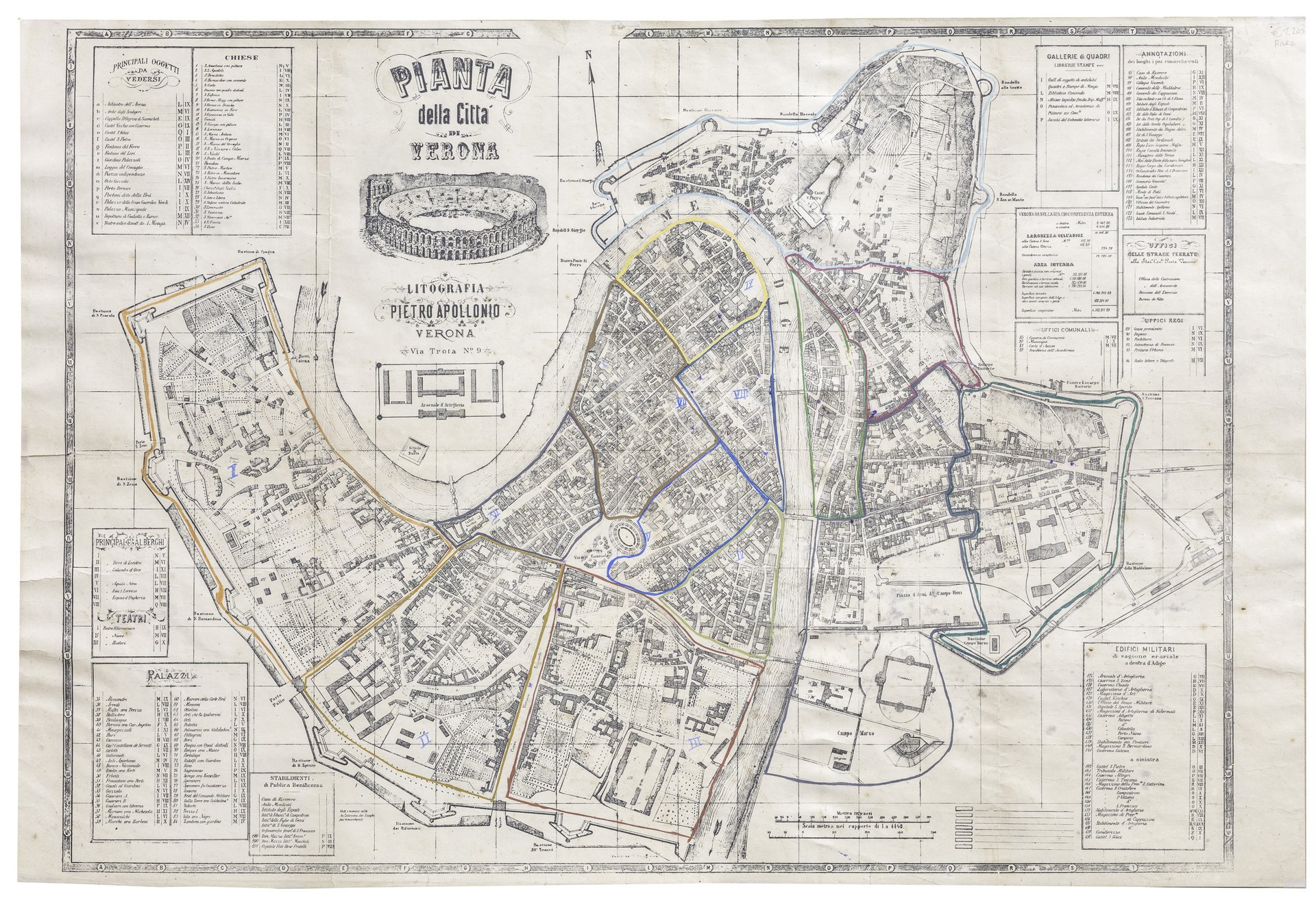Litografia, mm 634x870, parzialmente dipinta a mano. Pianta molto rara per la dimensione e la carta usata, pubblicata da un piccolo editore locale. Dopo la grande inondazione dell’Adige del 1883 l’editore Apollonio riutilizzò la matrice, sostanzialmente inalterata, inserendo però una legenda con molti più rimandi ed evidenziando in blu le zone di Verona allagate (vedi Antiche stampe di Verona, di Girardi e Perini, Cierre, 2010). Bibliografia: non in Girardi-Perini; non in Sinistri-Perini, Verona nelle antiche stampe, 1978, che cita a pag. 290 la versione post alluvione