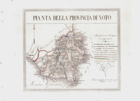Carta geografica tratta dal raro ' Atlante Corografico del Regno delle Due Sicilie tratto dalla Gran Carta d' Italia dedicato ad Adriano Balbi alla scala di 1/5 e corretto nella divisione amministrativa Civile Giudiziaria e Diocesana e nella indicazione delle strade rotabili di ultima costruzione, ' edito a Napoli nel 1856. Gabriello De Sanctis fu autore di un ' Atlante Corografico del Regno delle Due Sicilie, edito a Napoli (tre edizioni tra il 1840 al 1856), con 27 magnifiche carte geografiche. Le carte di questa raccolta dedicata a Adriano Balbi sono una riduzione di quella dell’Atlante Corografico del Regno delle Due Sicilie. Il materiale che utilizzò per la compilazione era costituito dai due atlanti, realizzati da Benedetto Marzolla e da Luigi De Salvatori. Di fatto, De Sanctis non era né geografo né topografo, e il suo atlante è anzitutto un’opera di compilazione. Le tavole, prive di reticolo geografico, sono veri e propri esercizi di grafica e calligrafica, che fanno dell’opera uno dei più raffinati atlanti del secolo. Inoltre, riflettono il suo interesse per i dati statistici. Ogni tavola è adornata con lo stemma della provincia rappresentata. Incisione in rame con coloritura coeva dei contorni, leggere ossidazioni della carta, per il resto in ottimo stato di conservazione. Map taken from the rare ' Atlante Corografico del Regno delle Due Sicilie tratto dalla Gran Carta d' Italia dedicato ad Adriano Balbi alla scala di 1/5 e corretto nella divisione amministrativa Civile Giudiziaria e Diocesana e nella indicazione delle strade rotabili di ultima costruzione ' published in Naples in 1856. Gabriello De Sanctis was the author of the ' Atlante Corografico del Regno delle Due Sicilie, published in Naples (three editions between 1840 and 1856), with 27 magnificent maps. The maps in this collection dedicated to Adriano Balbi are a reduction of that in ' Atlante Corografico del Regno delle Due Sicilie. The material he used for the compilation was the two atlases, made by Benedetto Marzolla and Luigi De Salvatori. In fact, De Sanctis was neither geographer nor topographer, and his atlas is first and foremost a work of compilation. The plates, devoid of a geographical grid, are true exercises in graphic design and calligraphy, making the work one of the finest atlases of the century. They also reflect his interest in statistical data. Each plate is adorned with the coat of arms of the province represented. Copperplate engraving with contempporary coloring of the outlines, slight oxidation of the paper, otherwise in excellent condition. Cfr.