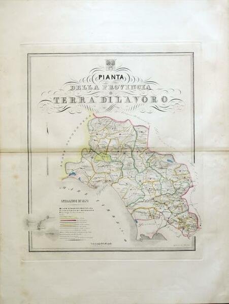 1845 circa. Incisione in rame all'acquaforte, confini in coeva coloritura d'epoca, cm 38,5 x 46 (alla lastra), cm 49 x 65 (con margini). Carta geografica della regione di Terra di Lavoro, allora provincia del Regno delle Due Sicilie, tratta dall' “Atlante Corografico del Regno delle Due Sicilie”, edito a Napoli dal 1840 al 1856. Dell' "Atlante" furono realizzate tre ristampe (la prima, come di frequente all'epoca, uscì dapprima a dispense) e venne anche stampato un Manifesto di Associazione, probabilmente nel 1843, allo scopo di raccogliere sottoscrizioni per l’opera, nel quale era descritto il contenuto dell’opera, le carte già realizzate e il relativo costo; nel prospetto furono previste anche due tavole con la “Posizione astronomica, topografica e geodesia, popolazione e divisione amministrativa…” che però non furono mai realizzate. Il materiale che si utilizzò per la compilazione, era costituito dai due atlanti, anteriori solo di un decennio, realizzati dal Marzolla e dal De Salvatori. Di fatto il De Sanctis non era né geografo né topografo, e il suo atlante è anzitutto un’opera di compilazione e un esercizio di grafica e calligrafica: le tavole sono prive di reticolo geografico e ogni tavola è adornata con lo stemma della provincia rappresentata, aspetti che però rendono l’opera uno dei più raffinati atlanti del secolo. Solo un lieve alone marginale al margine laterale destro e un paio di leggere macchie di ossidazione al margine laterale sinistro, peraltro bella, in ampi margini e in ottimo stato di conservazione. .