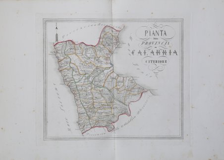 Carta geografica tratta dal raro ' Atlante Corografico del Regno delle Due Sicilie tratto dalla Gran Carta d' Italia dedicato ad Adriano Balbi alla scala di 1/5 e corretto nella divisione amministrativa Civile Giudiziaria e Diocesana e nella indicazione delle strade rotabili di ultima costruzione, ' edito a Napoli nel 1856. Gabriello De Sanctis fu autore di un ' Atlante Corografico del Regno delle Due Sicilie, edito a Napoli (tre edizioni tra il 1840 al 1856), con 27 magnifiche carte geografiche. Le carte di questa raccolta dedicata a Adriano Balbi sono una riduzione di quella dell’Atlante Corografico del Regno delle Due Sicilie. Il materiale che utilizzò per la compilazione era costituito dai due atlanti, realizzati da Benedetto Marzolla e da Luigi De Salvatori. Di fatto, De Sanctis non era né geografo né topografo, e il suo atlante è anzitutto un’opera di compilazione. Le tavole, prive di reticolo geografico, sono veri e propri esercizi di grafica e calligrafica, che fanno dell’opera uno dei più raffinati atlanti del secolo. Inoltre, riflettono il suo interesse per i dati statistici. Ogni tavola è adornata con lo stemma della provincia rappresentata. Incisione in rame con coloritura coeva dei contorni, leggere ossidazioni della carta, per il resto in ottimo stato di conservazione. Map taken from the rare ' Atlante Corografico del Regno delle Due Sicilie tratto dalla Gran Carta d' Italia dedicato ad Adriano Balbi alla scala di 1/5 e corretto nella divisione amministrativa Civile Giudiziaria e Diocesana e nella indicazione delle strade rotabili di ultima costruzione ' published in Naples in 1856. Gabriello De Sanctis was the author of the ' Atlante Corografico del Regno delle Due Sicilie, published in Naples (three editions between 1840 and 1856), with 27 magnificent maps. The maps in this collection dedicated to Adriano Balbi are a reduction of that in ' Atlante Corografico del Regno delle Due Sicilie. The material he used for the compilation was the two atlases, made by Benedetto Marzolla and Luigi De Salvatori. In fact, De Sanctis was neither geographer nor topographer, and his atlas is first and foremost a work of compilation. The plates, devoid of a geographical grid, are true exercises in graphic design and calligraphy, making the work one of the finest atlases of the century. They also reflect his interest in statistical data. Each plate is adorned with the coat of arms of the province represented. Copperplate engraving with contempporary coloring of the outlines, slight oxidation of the paper, otherwise in excellent condition. Cfr.