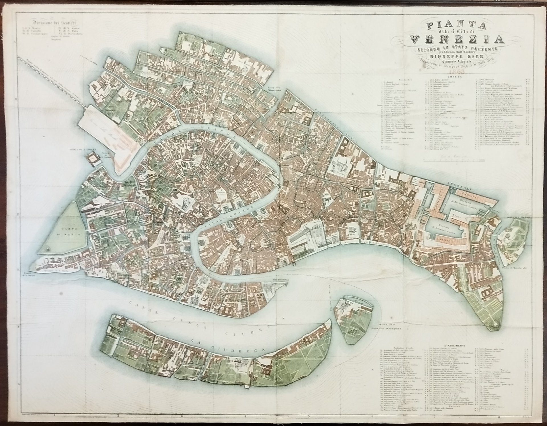 Incisione in rame di mm 570 x 727, colorata a stampa, applicata su tela. Quinto stato su cinque. Qualche traccia d'uso, ma buon esemplare. Iscrizioni : in alto a sinistra i nomi dei Sestieri, a destra titolo ed editore e sotto 180 nomi relativi ai luoghi più notevoli; a timbro in rosso "1863". Di fine esecuzione e di notevole valore documentario, è un'aggiornata pianta topografica della città e delle isole della Giudecca e di S. Giorgio Maggiore. Sono evidenziate con segno più marcato le aree di maggior interesse e rappresentati in elevazione i principali palazzi e monumenti; sono inoltre segnati con linee tratteggiate i traghetti e i confini dei Sestieri.(EN) Copper engraving measuring 570 x 727 mm, colored by print, applied on canvas. Fifth state out of five. Some traces of use, but good example. Inscriptions: at the top left the names of the Sestieri, on the right title and publisher and below 180 names relating to the most notable places; stamped in red "1863". Finely executed and of notable documentary value, it is an updated topographical map of the city and the islands of Giudecca and S. Giorgio Maggiore. The areas of greatest interest are highlighted with a more marked sign and the main buildings and monuments are represented in elevation; the ferries and the boundaries of the Sestieri are also marked with dotted lines.