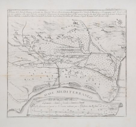 Importante documento sulle Paludi Pontine, inciso da Giovan Battista Ghigi nel 1778 sulla base del rilievo dell’ingegnere idraulico Gaetano Rappini, incaricato da papa Pio VI della bonifica della regione. In alto, vicino al margine sinistro, priva di riquadro, l'iscrizione commentata della "Descrizione del Nuovo Alveo per la Linea Pia"; nell'angolo superiore sinistro, il riquadro con la legenda "Avvertimento", per la rappresentazione, attraverso tre tipi di tratteggio, dei tre stati di palude (la "Palude permanente", la "Palude inondante a ogni pioggia' e la "Palude inondante in massime piogge”). Circa a metà del margine sinistro, l'elegante cartiglio, con stemma pontificio, dedicato al "Beatissimo Padre [.] Cola presente Carta io mi sono accinto a trasmettere alla Posterità un'Idea del savissimo Piano di questa grand'Opera seguito dal commento alla carta in relazione alla bonifica, con firma dell'autore Giambattista Ghisi: "Di Vostra Santità / Umilissimo, Devotissimo, ed Obbligatissimo Servo / Giambattista Ghigi / Roma 14 Feb 1778", Nella parte inferiore della carta, un'ampia fascia con INDICE numerato dei luoghi, a cui segue il "PIANO DELL'IMPRESA". Nel settore centrale, la "Scala di Tre Miglia Romane, che sono canne 2000". Margini non graduati., rosa dei venti schematica in alto a sinistra. “Questa carta, ripresa da quella del Sani per l'impianto generale e da quella del Rappini per il complessivo sistema idrografico e la delineazione del Circondario pontino, rappresenta lo stato reale delle paludi pontine poco prima dell'intervento di bonifica voluto da Pio VI, con l'indicazione delle aree invase in modo permanente dalla palude, le aree inondate nel corso di ogni pioggia e le aree inondate occasionalmente in caso di forti piogge, secondo i "tre stati di palude' codificati graficamente nell'apposita legenda attraverso diverse tipologie di tratteggi. Pio VI commissionò una delle più colossali opere di bonifica delle Paludi Pontine, impostando con rigore il progetto basandosi sulle esperienze dei precedenti tentativi di bonifica ed individuando le cause di insuccesso. La carta del Ghigi illustra le bonifiche autorizzate da papa Pio VI (1755-1799); i lavori furono iniziati nell'autunno del 1777 con lo scavo di un nuovo canale navigabile che, in onore del Pontefice, venne chiamato Linea Pio, il quale attraversa la pianura longitudinalmente e sfocia in mare nei pressi di Terracina. Il lungo rettifilo che si distingue in senso longitudinale è il tratto del decennovio della via Appia. Le sottili linee perpendicolari, invece, rappresentano i fossi tracciati in corrispondenza delle pietre miliari della via Appia, per lo scolo dei terreni dalle piogge” (cfr. M. G. Cocco in “Strade, canali, confini e rotte. I simboli lineari nella cartografia antica” a cura Associazione Roberto Almagià Collezionisti Italiani di Cartografia Antica, p. 40, tav. 13). Sotto il nome di “Paludi Pontine” e con quello odierno di Agro Pontino si intende il territorio compreso fra i Monti Lepini e gli Ausoni, il Mar Tirreno e il promontorio del Circeo. Un territorio che si estende fin verso Roma, senza un confine fisico ben definito che distingua l’Agro Pontino dall’Agro Romano, anche per le caratteristiche geologiche e fisiche del suolo; comunque come limite, puramente convenzionale, tra l’Agro Romano e l’Agro Pontino si può considerare il corso inferiore e medio del Fiume Astura e una linea immaginaria che, partendo dai piedi della collina su cui sorge Cori, all’altezza di circa 120 m sul livello del mare, e mantenendosi su questa quota, si spinge fino ai piedi dell’altura su cui è posta Lanuvio. Si può affermare che, stando a quanto pervenuto sino a noi, la conoscenza della regione pontina era molto imprecisa allorché Sisto V pose mano ai grandi lavori idraulici diretti da Ascanio Fenizi (1585÷1590). Due carte successive rendono con efficacia lo stato della palude prima della bonifica di Pio VI, quella del Ghigi. Importante documento sulle Paludi Pontine, inciso da Giovan Battista Ghigi nel 1778 sulla base del rilievo dell’ingegnere idraulico Gaetano Rappini, incaricato da papa Pio VI della bonifica della regione. In alto, vicino al margine sinistro, priva di riquadro, l'iscrizione commentata della "Descrizione del Nuovo Alveo per la Linea Pia"; nell'angolo superiore sinistro, il riquadro con la legenda "Avvertimento", per la rappresentazione, attraverso tre tipi di tratteggio, dei tre stati di palude (la "Palude permanente", la "Palude inondante a ogni pioggia' ' e la "Palude inondante in massime ' piogge”). Circa a metà del margine sinistro, l'elegante cartiglio, con stemma pontificio, dedicato al "Beatissimo Padre [.] Cola presente Carta io mi sono accinto a trasmettere alla Posterità un'Idea del savissimo Piano di questa grand'Opera ' seguito dal commento alla carta in relazione alla bonifica, con firma dell'autore Giambattista Ghisi: "Di Vostra Santità / Umilissimo, Devotissimo, ed Obbligatissimo Servo / Giambattista Ghigi / Roma 14 Feb 1778", Nella parte inferiore della carta, un'ampia fascia con ' INDICE ' numerato dei luoghi, a cui segue il "PIANO DELL'IMPRESA". Nel settore centrale, la "Scala di Tre Miglia Romane, che sono canne 2000". Margini non graduati., rosa dei venti schematica in alto a sinistra. “Questa carta, ripresa da quella del Sani per l'impianto generale e da quella del Rappini per il complessivo sistema idrografico e la delineazione del Circondario pontino, rappresenta lo stato reale delle paludi pontine poco prima dell'intervento di bonifica voluto da Pio VI, con l'indicazione delle aree invase in modo permanente dalla palude, le aree inondate nel corso di ogni pioggia e le aree inondate occasionalmente in caso di forti piogge, secondo i "tre stati di palude' codificati graficamente nell'apposita legenda attraverso diverse tipologie di tratteggi. Pio VI commissionò una delle più colossali opere di bonifica delle Paludi Pontine, impostando con r