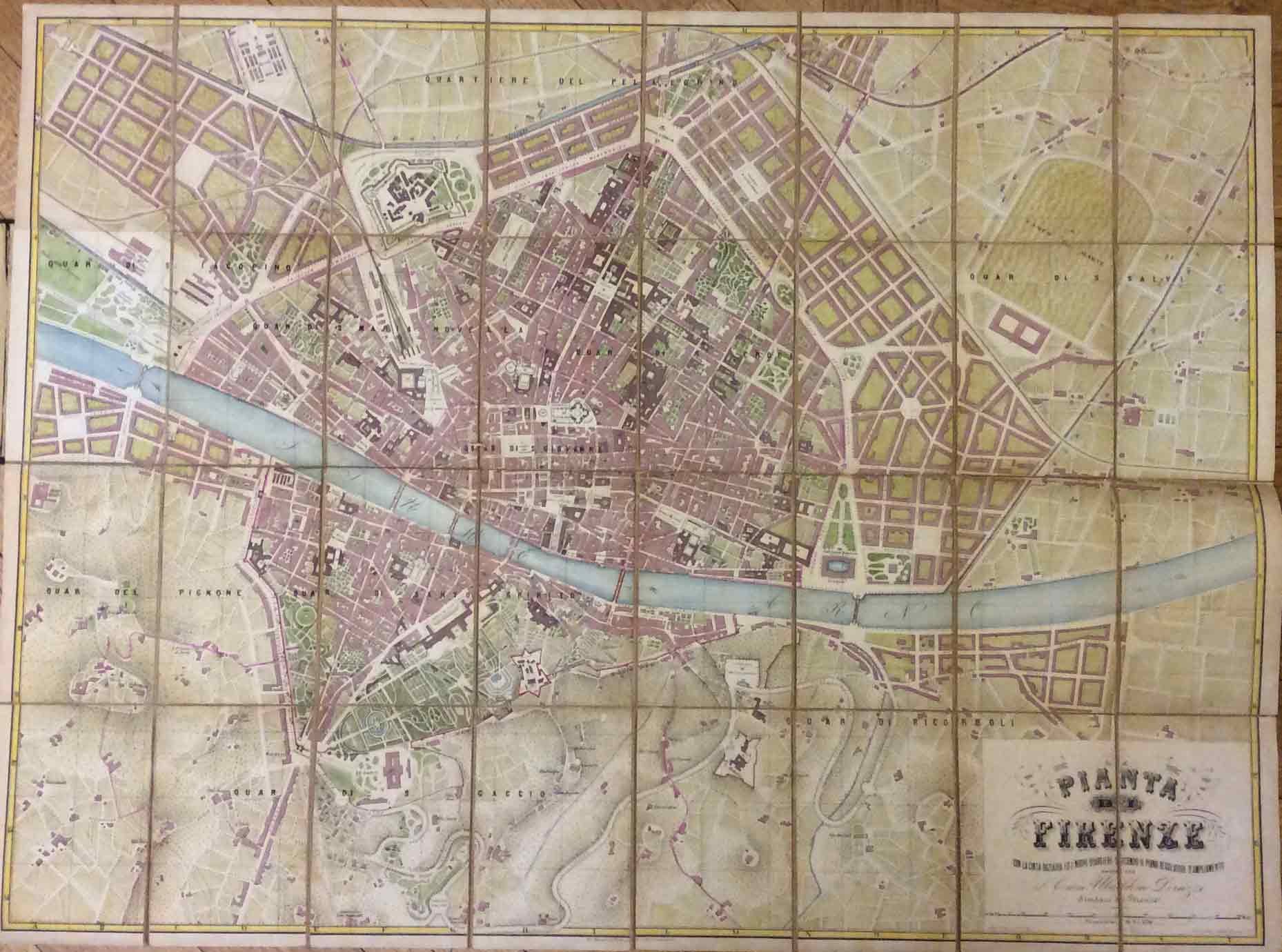 Bella pianta della città Firenze (cm. 90x71) in litografia e colorata a mano; suddivisa in 32 riquadri è montata su tela e incisa da S. Benelli su disegno dell'Ing. Romanelli. Esemplare ben conservato, posto in custodia in tela coeva (cm. 18,2x12,2), .