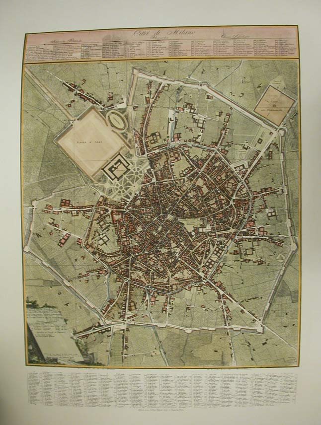 Cm. 99 x 70,5. Riproduzione, colorata a mano, della celebre pianta della Milano napoleonica, realizzata da Giacomo Pinchetti.In buono stato.