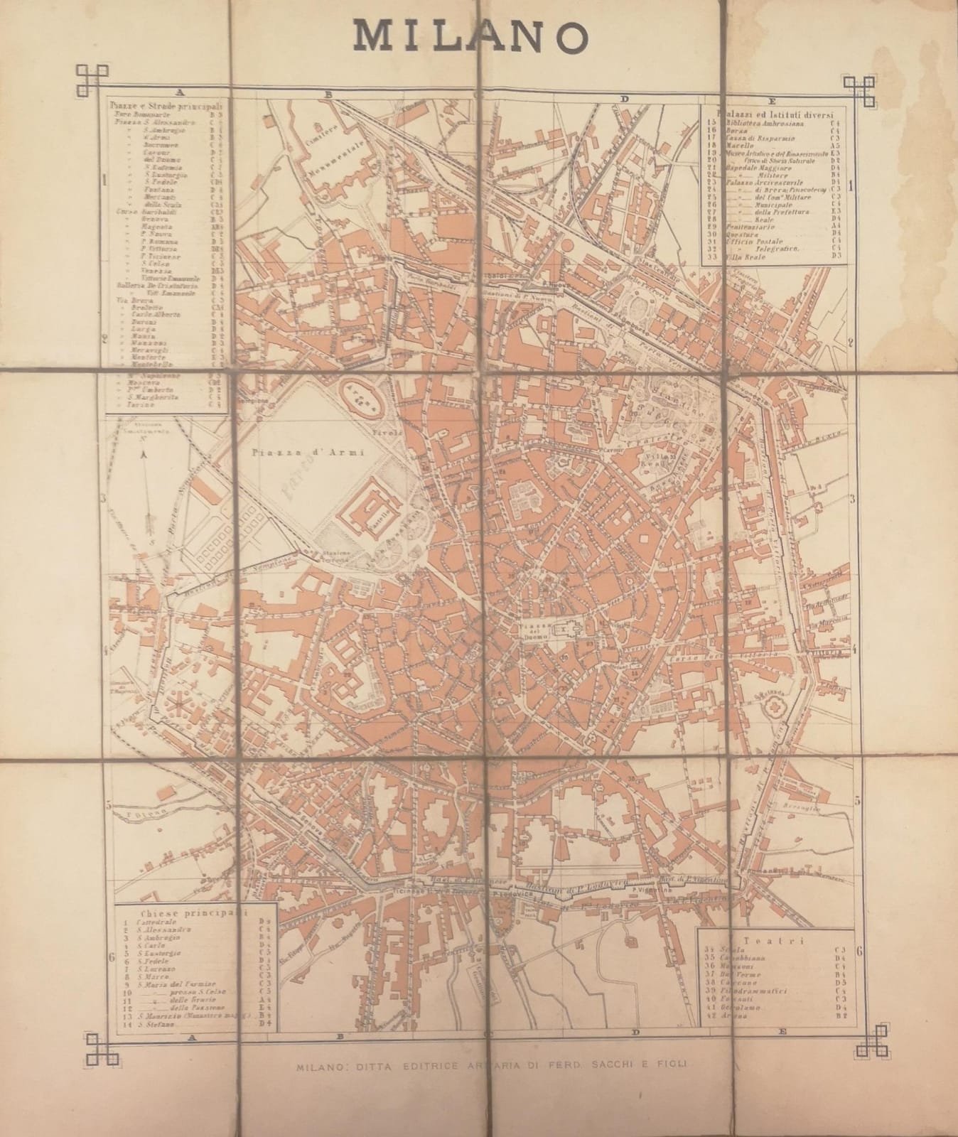 Pianta di Milano litografata a colori (mm. 570x480), montata su tela e suddivisa in 12 riquadri. Titolo in alto nel mezzo. In quattro riquadri agli angoli della pianta, notizie sulle Piazze e strade principali, sui Palazzi ed istituti diversi, sui teatri e sulle Chiese principali. Ben conservata.