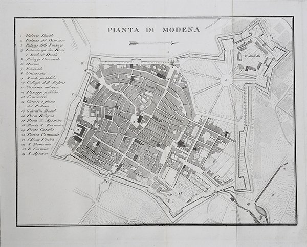 Pianta di Modena tratta dal "Viaggi in Italia per Francesco Gandini, overo descrizione Geografica, Storica, Pittorica, Statistica Postale e Commerciale dell'Italia", edito a Cremona dal 1830 al 1836.Affascinante opera in otto volumi (nove tomi) riguardanti: Quadro generale dell'Italia, Stati di Sardegna, Governo di Milano, Governo di Venezia, Ducati di Parma Piacenza Massa etc., Gran Ducato di Toscana, Stato della Chiesa, Regno di Napoli e Isole dell'Italia. Numerose tavole fuori testo incise all'acquatinta dal Landini raffiguranti vedute di città italiane.Incisione in rame, in ottimo stato di conservazione. Pianta di Modena tratta dal "Viaggi in Italia per Francesco Gandini, overo descrizione Geografica, Storica, Pittorica, Statistica Postale e Commerciale dell'Italia", edito a Cremona dal 1830 al 1836.Affascinante opera in otto volumi (nove tomi) riguardanti: Quadro generale dell'Italia, Stati di Sardegna, Governo di Milano, Governo di Venezia, Ducati di Parma Piacenza Massa etc., Gran Ducato di Toscana, Stato della Chiesa, Regno di Napoli e Isole dell'Italia. Numerose tavole fuori testo incise all'acquatinta dal Landini raffiguranti vedute di città italiane.Incisione in rame, in ottimo stato di conservazione. Cfr.