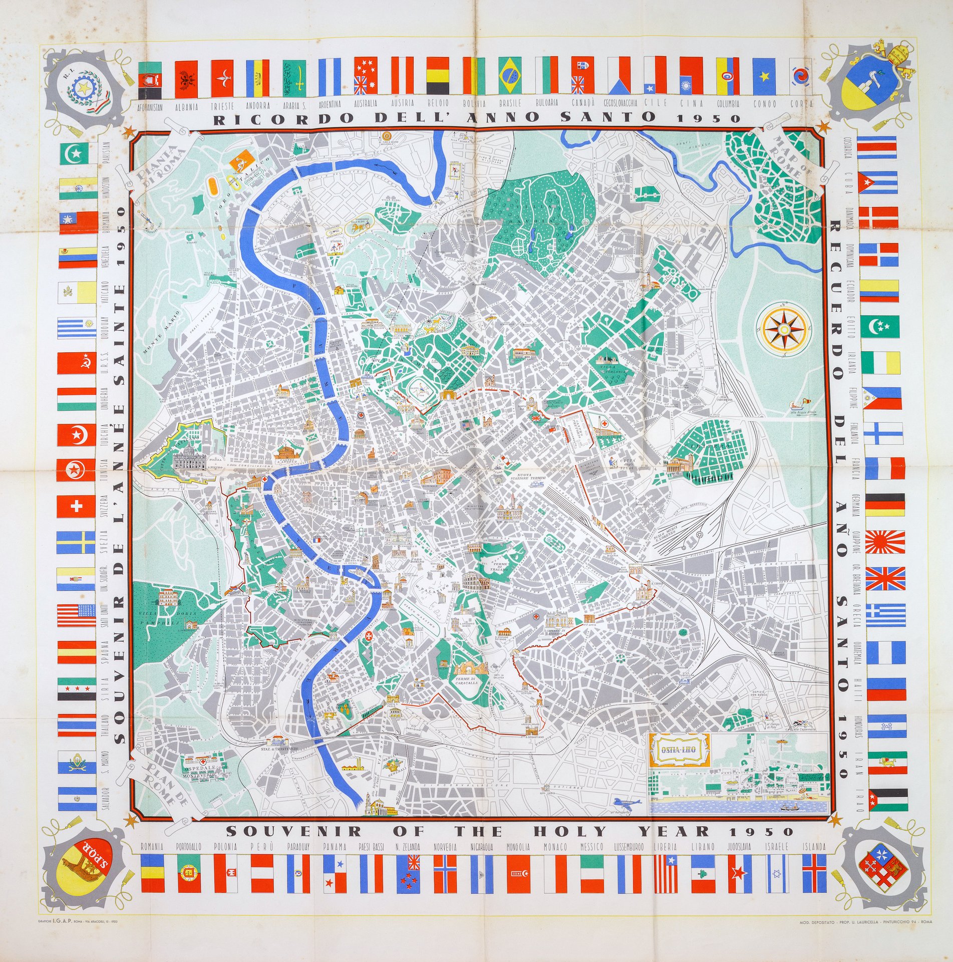 Litografia a colori, mm 1000x1000. Grande pianta della città, circondata da 76 bandiere del mondo, stemmi di Roma, Vaticano, Italia e repubbliche marinare negli angoli. Fu approntata per i turisti in visita durante il Giubileo del 1950 convocato dopo la guerra da Pio XII. Presenta pieghe editoriali ma si presenta in ottimo stato con qualche traccia di ossidazione e sporco superficiale alle due sezioni esterne.