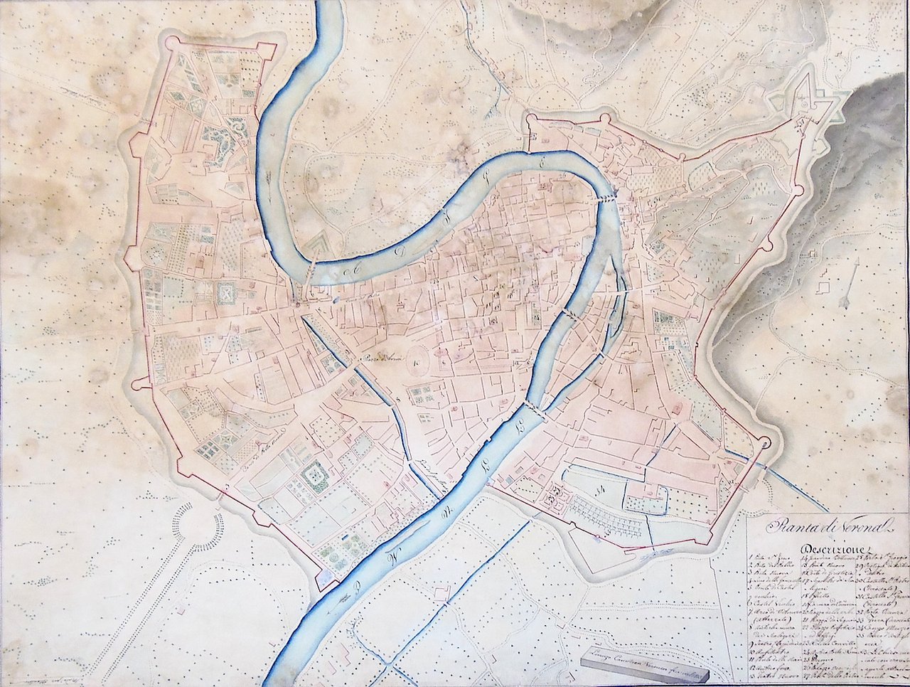 Manoscritto eseguito ad acquerello policromo, mm 450x590. Raro foglio manoscritto di grande formato raffigurante una pianta della città eseguita, secondo lo stile del periodo, con estrema precisione e realismo. Il 1813, anno di esecuzione del manoscritto, è l'ultimo anno di presenza francese a Verona. Il 4 febbraio 1814 gli austriaci rientrano in città da liberatori, dopo che, in seguito al trattato di Luneville del 1801 la città, precedentemente in mano austriaca, grazie al trattato di Campoformio, era stata spartita fra le due potenze con i francesi sulla riva destra dell'Adige (centro città) e gli austriaci sulla sinistra (Veronetta). Si notano nella parte occidentale della città, tutti gli orti ancora presenti all'interno delle mura. In basso a destra è firmata "Lorenzo Canestran veronese fece nel 1813" e riporta una legenda con 35 rimandi su tre colonne. Il disegno occupa tutto il foglio che non ha quindi margini. Nonostante un accenno di umidità, visibile soprattutto al verso, ma anche in alto a sinistra, il foglio si presenta integro e perfettamente leggibile oltre che assai fascinoso