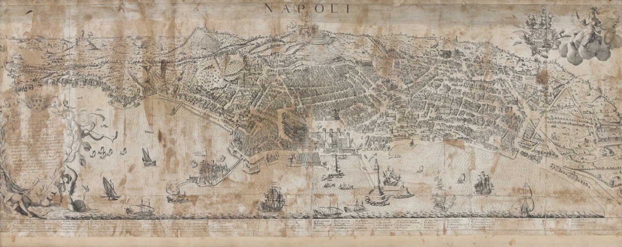 PETRINI PAOLO. Pianta e alzata della città di Napoli. Incisione su rame. 1698. Cm.42x108. Diffuse bruniture. Esemplare privo delle vedute di contorno alla pianta.