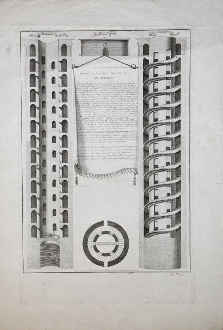 Tavola raffigurante la pianta e la sezione del Pozzo di San Patrizio ad Orvieto tratta da Guglielmo Della Valle, Storia del duomo di Orvieto. Roma: presso i Lazzarini, MDCCXCI. Lo storico pozzo di San Patrizio è una struttura costruita da Antonio da Sangallo il Giovane a Orvieto tra il 1527 e il 1537 per volere del papa Clemente VII, reduce dal Sacco di Roma e desideroso di tutelarsi nell'eventualità che la città in cui si era ritirato fosse assediata. Pertanto, fu progettato proprio per fornire acqua in caso di calamità o assedio. Durante le assenze di Antonio da Sangallo l'esecuzione veniva seguita da Giovanni Battista da Cortona; le parti decorative sono di Simone Mosca. I lavori furono conclusi durante il papato di Paolo III Farnese (1534-1549). L'accesso al pozzo, capolavoro di ingegneria, è garantito da due rampe elicoidali a senso unico, completamente autonome e servite da due diverse porte, che consentivano di trasportare con i muli l'acqua estratta senza ostacolarsi e senza dover ricorrere all'unica via che saliva al paese dal fondovalle. Acquaforte, con margini, in ottimo stato di conservazione. Bibliografia Alberto Satolli, Imago VV, Le rappresentazioni della città di Orvieto dalle origini ad oggi, p. 122. Tavola raffigurante la pianta e la sezione del Pozzo di San Patrizio ad Orvieto tratta da Guglielmo Della Valle, ' Storia del duomo di Orvieto. Roma: presso i Lazzarini, MDCCXCI. Lo storico pozzo di San Patrizio è una struttura costruita da Antonio da Sangallo il Giovane a Orvieto tra il 1527 e il 1537 per volere del papa Clemente VII, reduce dal Sacco di Roma e desideroso di tutelarsi nell'eventualità che la città in cui si era ritirato fosse assediata. Pertanto, fu progettato proprio per fornire acqua in caso di calamità o assedio. Durante le assenze di Antonio da Sangallo l'esecuzione veniva seguita da Giovanni Battista da Cortona; le parti decorative sono di Simone Mosca. I lavori furono conclusi durante il papato di Paolo III Farnese (1534-1549). L'accesso al pozzo, capolavoro di ingegneria, è garantito da due rampe elicoidali a senso unico, completamente autonome e servite da due diverse porte, che consentivano di trasportare con i muli l'acqua estratta senza ostacolarsi e senza dover ricorrere all'unica via che saliva al paese dal fondovalle. Acquaforte, con margini, in ottimo stato di conservazione. Bibliografia Alberto Satolli, ' Imago VV, Le rappresentazioni della città di Orvieto dalle origini ad oggi, p. 122. Cfr.
