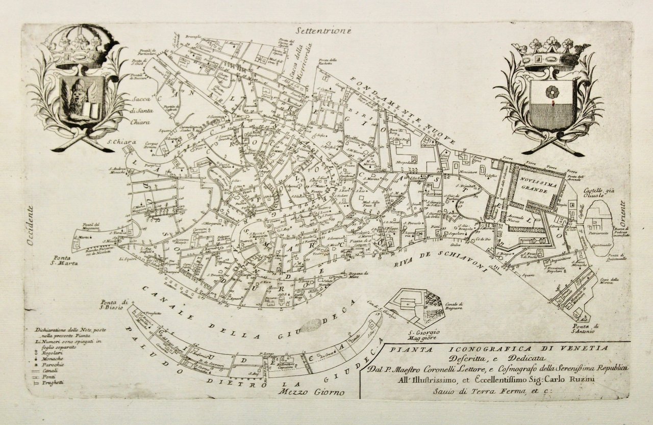 Incisione in rame, mm 270x435. Pianta delineata che evidenzia i canali, appositamente svuotata degli edifici privati in modo da segnare chiaramente quelli ecclesiastici, i teatri, gli ospedali. Arricchita a sinistra in alto da un leone di S. Marco e a destra dalle armi della famiglia Ruzzini. Perfettamente conservata, marginosa.